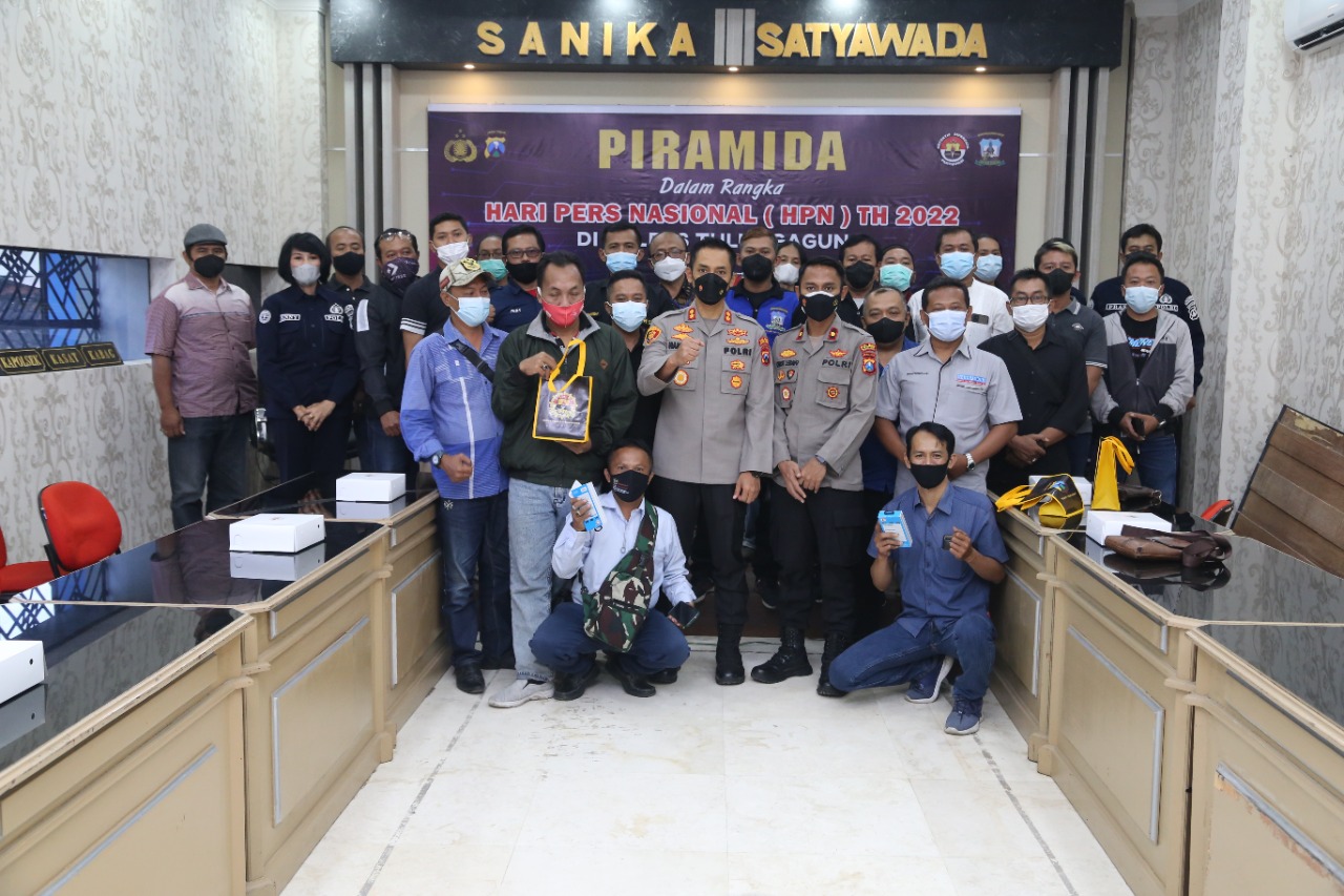 PIRAMIDA dan Tasyakuran HPN tahun 2022 dikemas sederhana dengan prosesi pemotongan tumpeng oleh AKBP Handono Subiakto dan secara simbolis diberikan kepada perwakilan awak media dari media online Bhirawa.