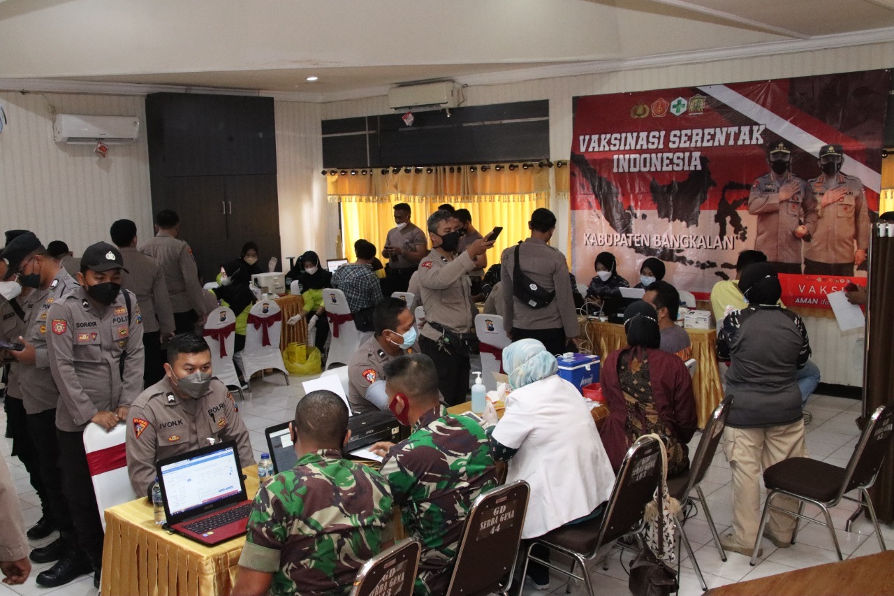 Bertempat di ruang Serbaguna Mapolres Bangkalan, jajaran forkopimda kabupaten Bangkalan pun antusias untuk divaksin. Bahkan, tim kesehatan dari 4 instansi berbeda yakni tim dari Puskesmas Kota Bangkalan, Faskes Kodim 0829 dan Lanal Batuporon, serta tim Dokkes Polres Bangkalan harus beradu dengan tetesan keringat yang mengucur begitu melihat antusiasme untuk vaksin booster.