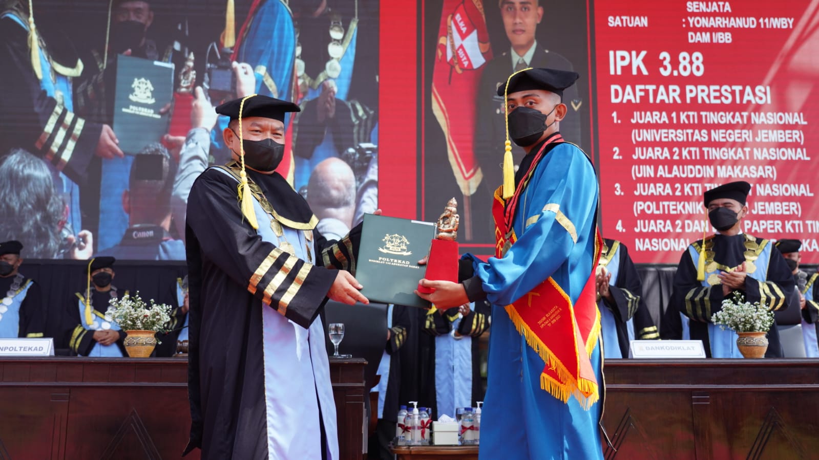 Tiga lulusan terbaik dengan predikat IPK tertinggi diraih oleh Serda (K) Roro Andi dari Prodi Telkommil ( IPK 3.91), Serda Adrian dari Prodi Elkasista (IPK 3.88), dan Sertu Lugas dari Prodi Otoranpur (IPK 3.86). Mahasiswa Poltekad merupakan prajurit Bintara dari seluruh satuan jajaran di TNI AD.