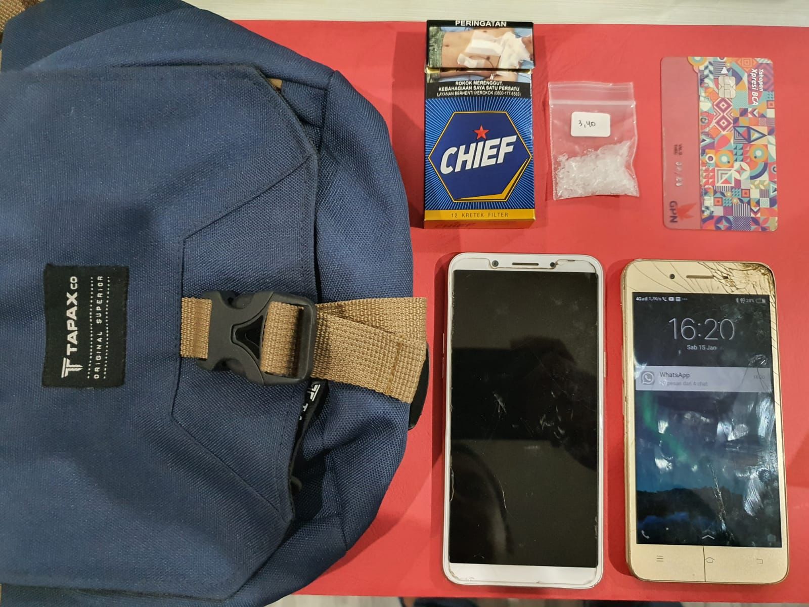 Dari keterangan terduga kemudian dilakukan penggeladahan terhadap TKP lainnya yaitu pada hari Jumat tanggal 14 Januari 2022 pukul 21.00 Wib di Kamar Apartemen dan dilakukan penangkapan tersangka RA dan oleh petugas dilakukan penggeledahan ditemukan barang bukti 1 (satu) bungkus plastic klip berisi Kristal putih yang diduga narkotika jenis sabu dengan berat + 0,44 (nol koma empat puluh empat ) gram serta bungkusnya, 1 (satu) bungkus plastic klip berisi Kristal putih yang diduga narkotika jenis sabu dengan berat + 0,44 (nol koma empat puluh empat ) gram serta bungkusnya, Pipet kaca yang masih terdapat Narkotika Jenis sabu dengan berat + 1,22 (satu koma dua puluh dua ) gram serta pipetnya, Pipet kaca yang masih terdapat Narkotika Jenis sabu dengan berat + 0,96 (nol koma Sembilan puluh enam ) gram serta pipetnya, 1 (satu) kotak korek api, 2 (dua) korek api, 1 (satu) alat hisap dari botol minuman, 1 (satu) unit Hp Iphone XR. ( TKP 2).