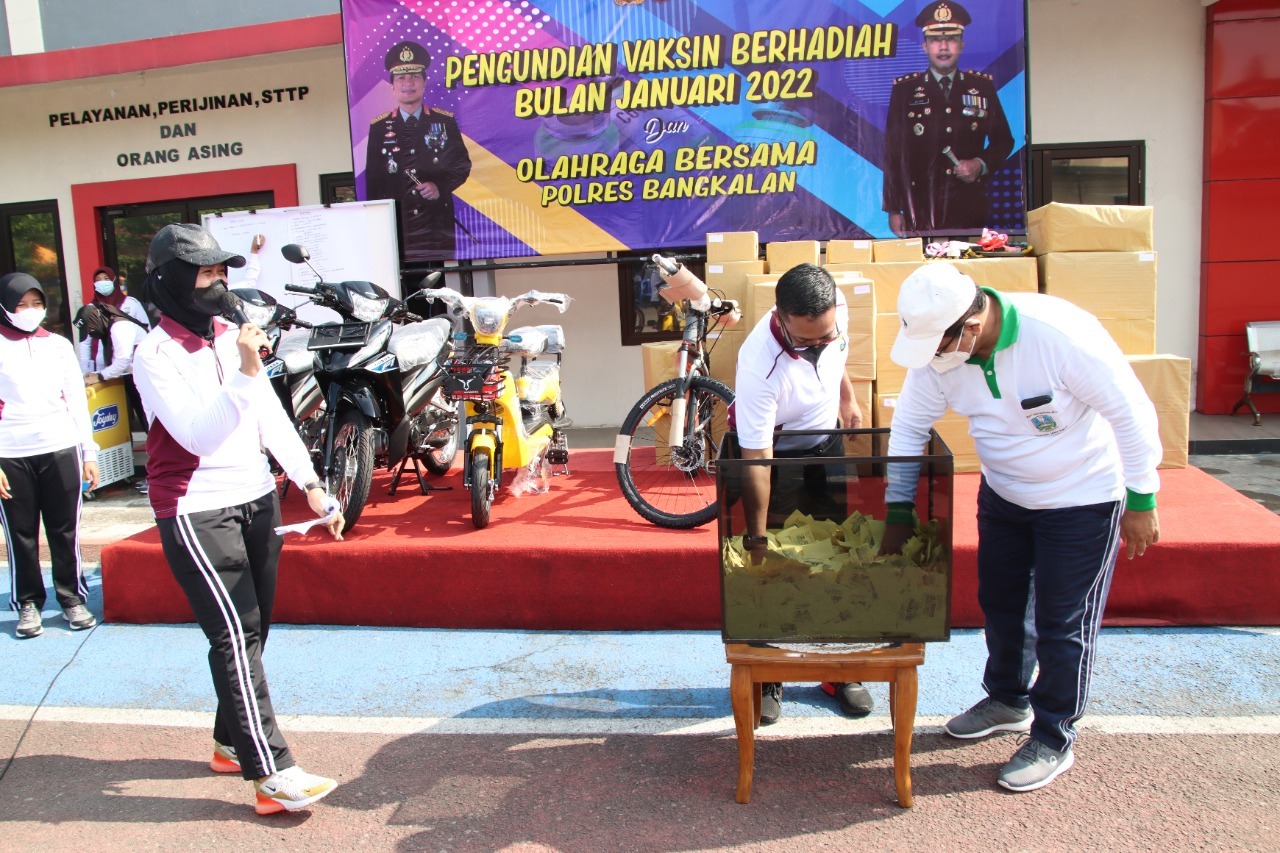 BANGKALAN, tNews.co.id – Kepolisian Resor Bangkalan pagi tadi, Sabtu (05/02/2022) menggelar pengundian vaksin berhadiah untuk periode 1 januari hingga 2 februari 2022 di Mapolres Bangkalan. Vaksinasi berhadiah ini diselenggarakan di seluruh gerai vaksinasi kabupaten Bangkalan. Hal ini dilakukan untuk meningkatkan dan mendorong semangat masyarakat luas dalam menyukseskan vaksinasi covid-19.