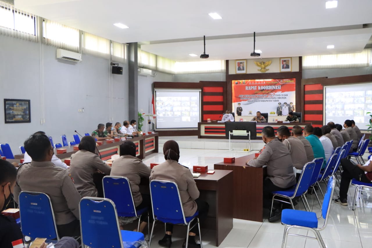 Bertempat di Gedung Sanika satyawada Mapolres setempat, kegiatan tersebut di hadiri oleh Kapolres Tuban AKBP Darman, S.I.K., Dandim 0811 Tuban Letkol Inf. Suhada Erwin, Asisten II Joko Sarwono, S.E., Kadinkes dr. Bambang Priyo Utomo serta di ikuti Forkopimka Jajaran melalui Zoom metting.