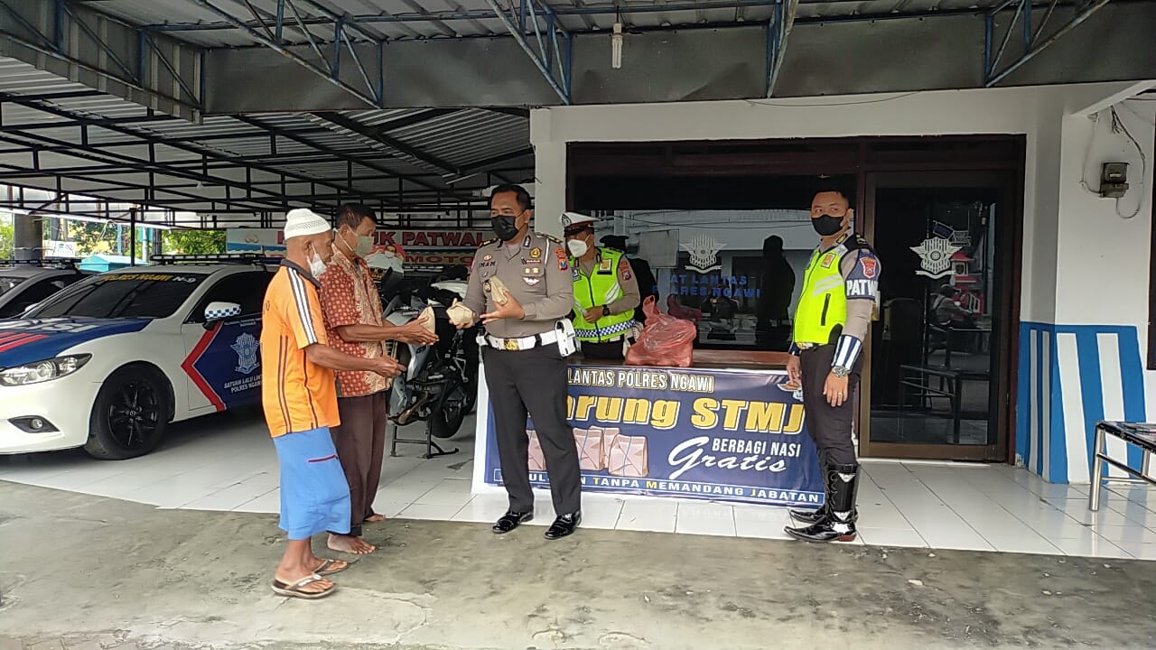 pengendara kendaraan bermotor, oleh karena itu sebagai bentuk kepedulian terhadap masyarakat yang telah antri sejak pagi, Satlantas Polres Ngawi menggelar “Warung Berkah Nasi Gratis”.