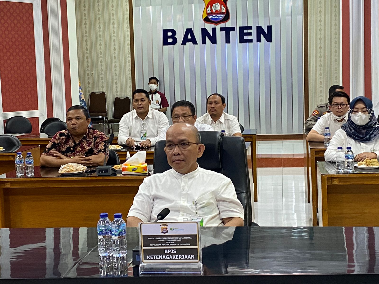 Hadir dalam kegiatan ini Asisten Deputi Direktur BPJS Ketenagakerjaan Wilayah Banten Galuh Santi Utari beserta Staf BPJS Ketenagakerjaan, diikuti oleh Wadirlantas Polda Banten AKBP Alfaris Pattiwael, Kabagbinops Ditreskrimum AKBP M. Nuril Huda, Kabag Kerma Biroops Polda Banten AKBP Kukuh Priyo Tarumo dan Polres Jajaran.