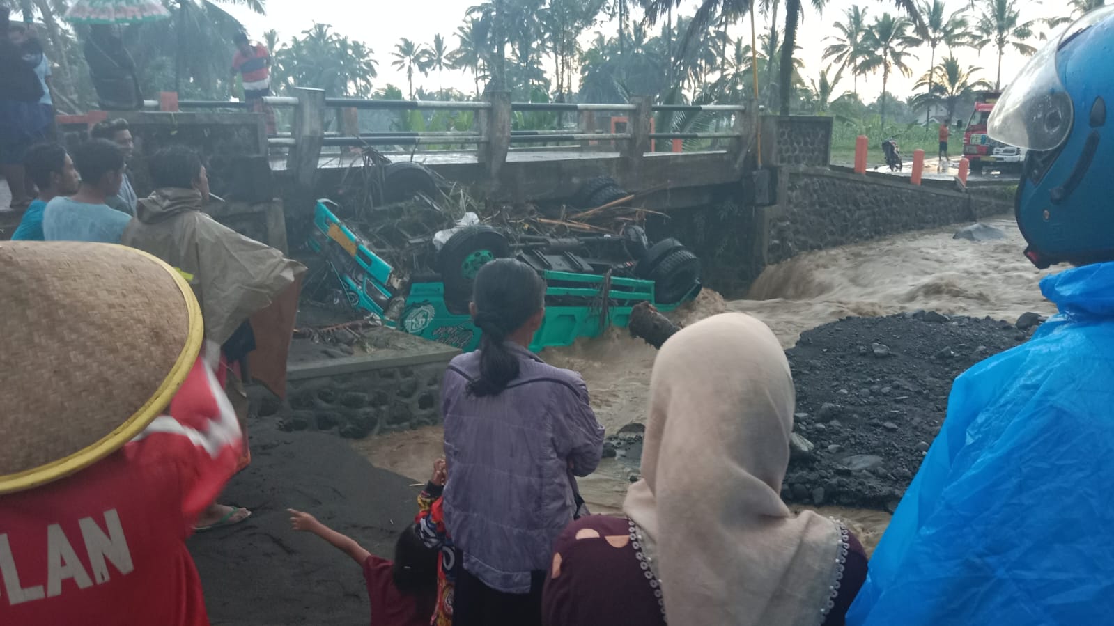 Namun nahas, banjir lahar semeru tiba-tiba datang menerjang sungai Cangka, truk yang mengalami trauble terseret hingga terbalik dibawah jembatan
