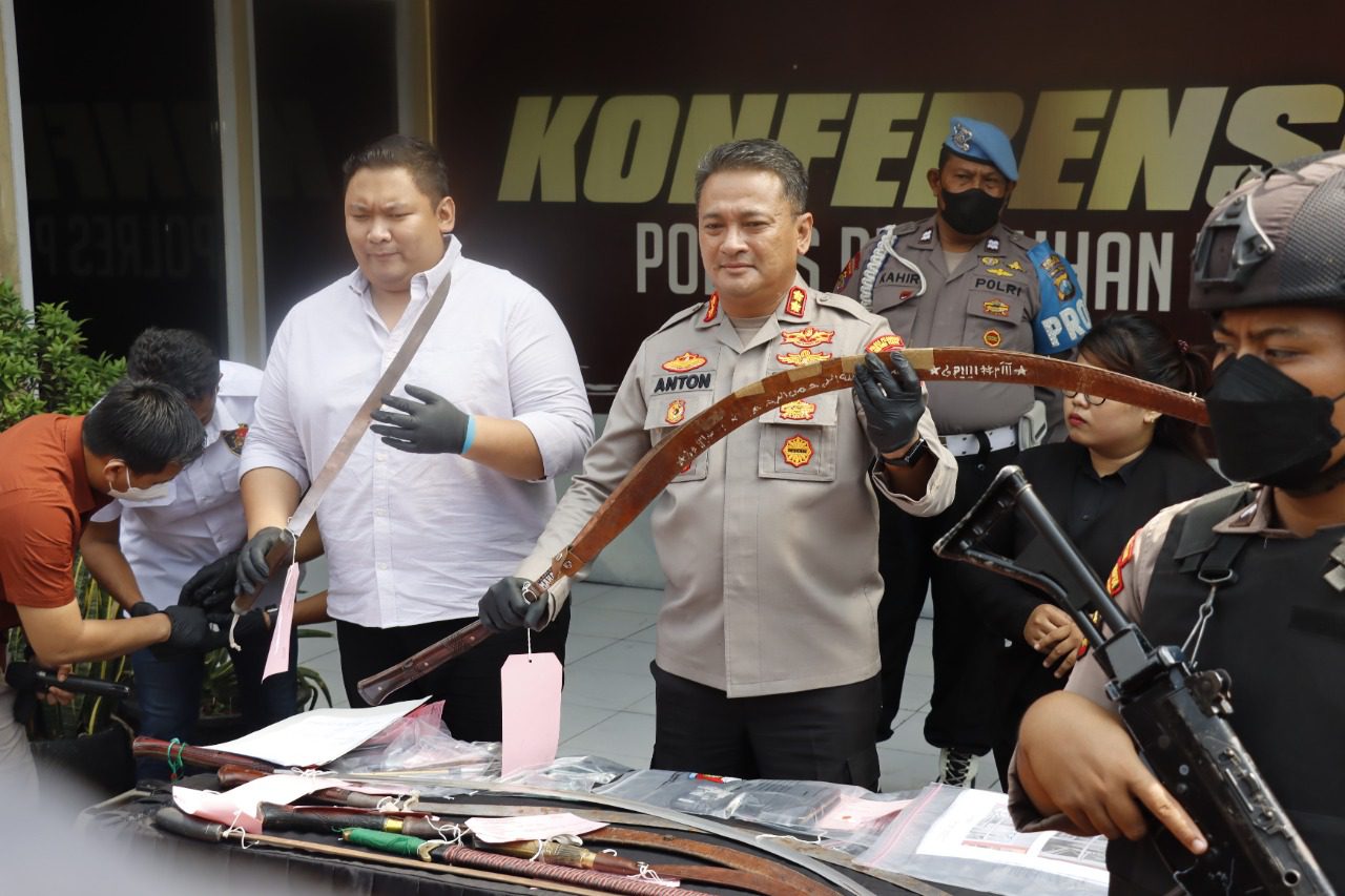 Selain meringkus 7 terduga pelaku, polisi juga mengamankan barang bukti CCTV TKP, tiga unit sepeda motor, tujuh buah senjata tajam jenis clurit dan pedang, dua buah stick golf, satu potongan besi, pecahan kaca pos security dan sembilan unit handphone.