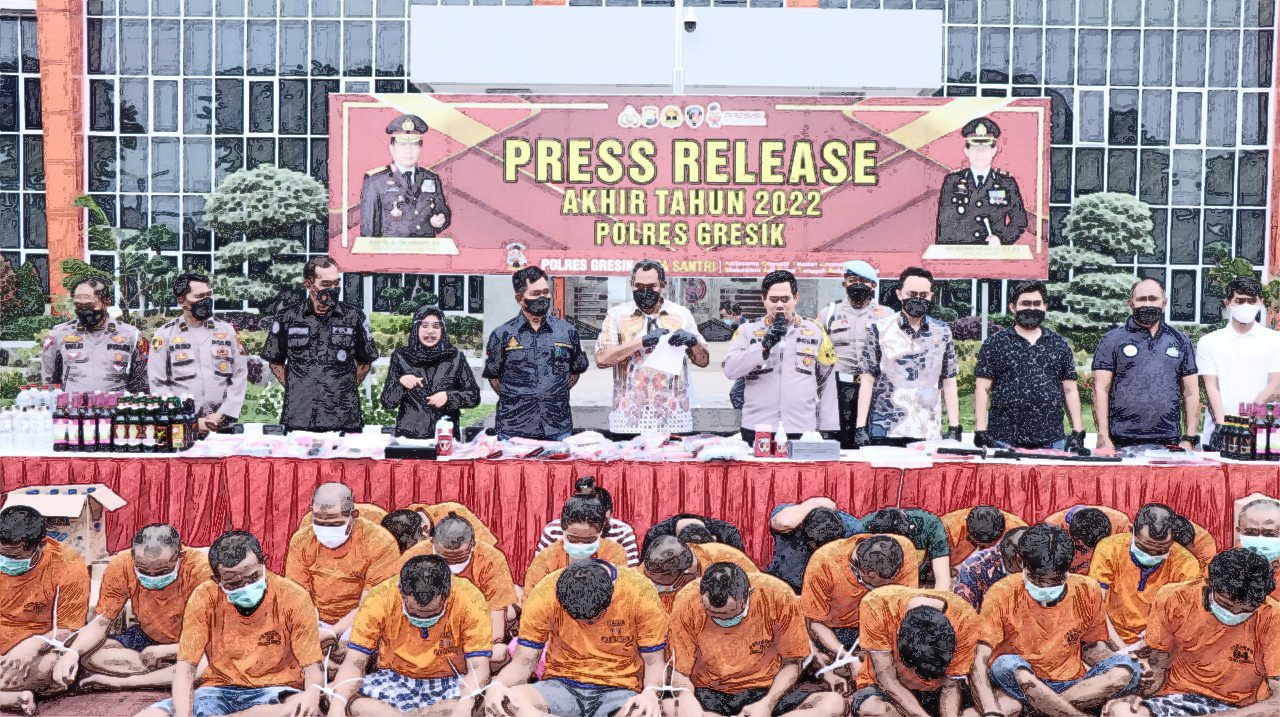 GRESIK, tNews.co.id – Pada penghujung tahun 2022, Polres Gresik menggelar press release di halaman Mapolres Gresik, Jumat 30 Desember 2022. Dipimpin langsung oleh Kapolres AKBP Mochamad Nur Azis disampaikan dihadapan awak media, sejumlah pengungkapan kasus, capaian, hingga tingkat penyelesaian kasus yang ditangani.