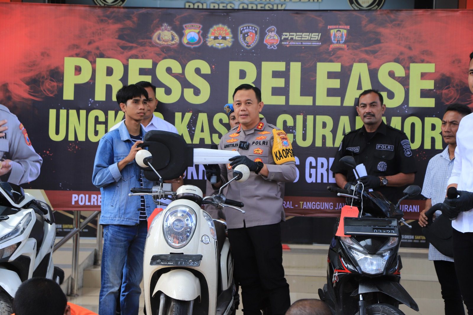 Penyerahan dilakukan Kapolres Gresik AKBP Adhitya menyerahkan sepeda motor ke pemilik dan mengimbau masyarakat yang merasa kehilangan sepeda motor untuk menghubungi Satreskrim Polres Gresik.