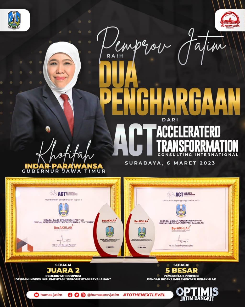 SURABAYA, tNews.co.id – Upaya pemerintah provinsi Jawa Timur dalam mengimplementasikan core values ASN BerAKHLAK (Berorientasi Pelayanan, Akuntabel, Kompeten, Harmonis, Loyal, Adaptif, dan Kolaboratif) mendapatkan penghargaan dari Accelerated Culture Transformation (ACT) Consulting International/ESQ Group.