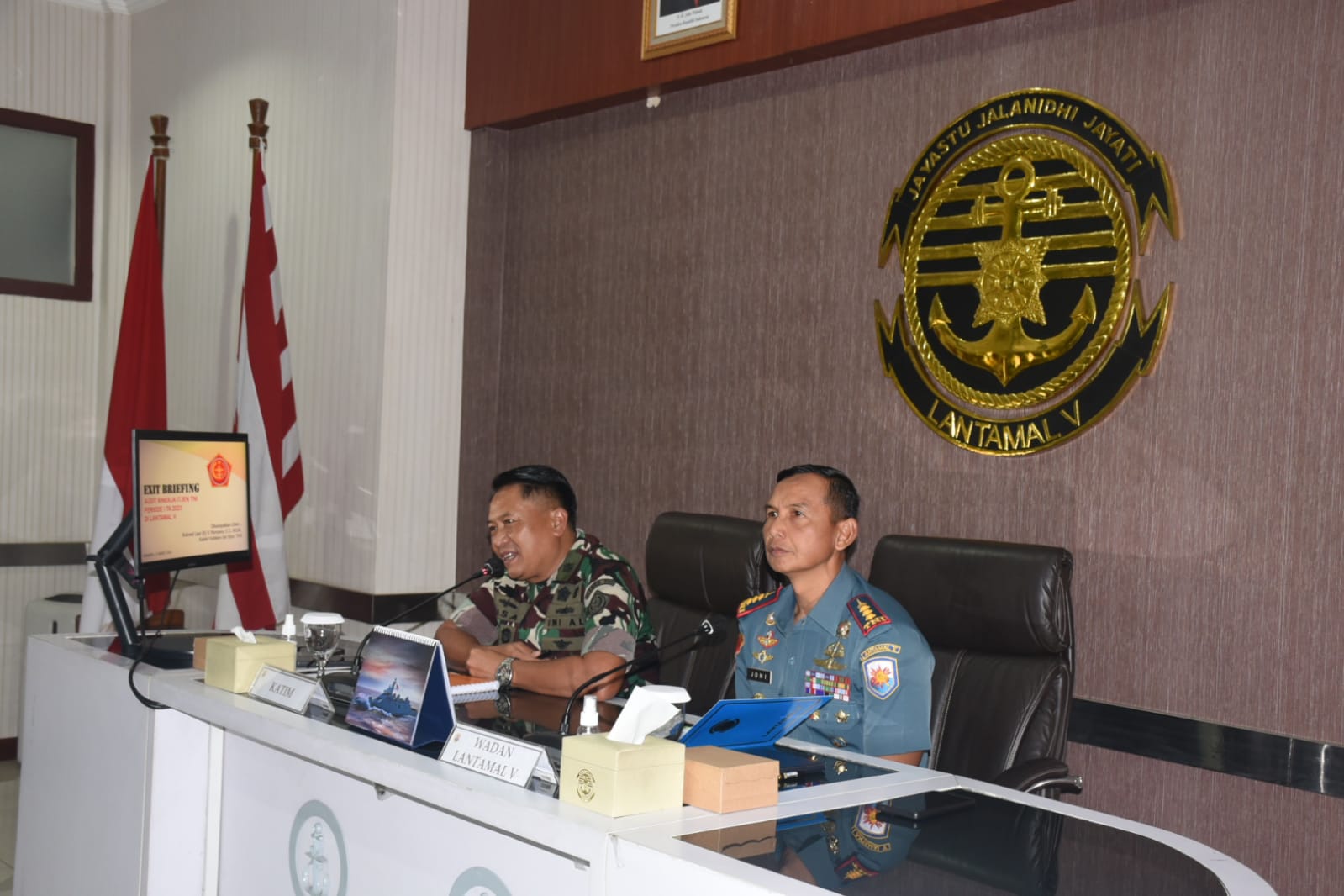SURABAYA, tNews co.id – Setelah tiga hari melaksankan kegiatan audit dari Tim Inspektorat Jendral (Itjen) TNI pada kesempatan ini Komandan Pangkalan Utama TNI AL (Danlantamal) V Laksamana Pertama TNI Supardi yang diwakilkan oleh Wadanlantamal V Kolonel Marinir Joni Sulistiawan menerima Exit Briefing oleh Kolonel Laut (E) Y. Nuryasa selaku Ketua Tim Audit yang bertempat di Ruang Rapat Mako Lantamal V, Rabu(15/03/2023).