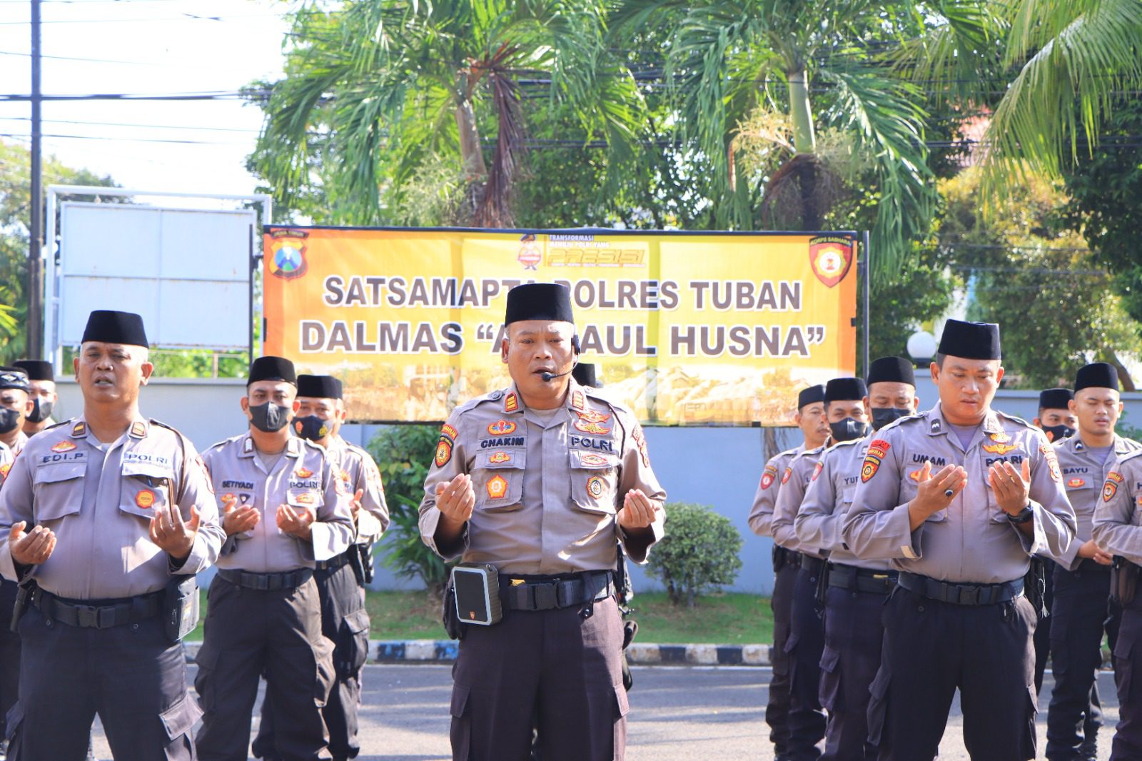 Pemandangan itu terlihat pagi ini, Rabu (29/03) saat puluhan anggota satuan Samapta Polres Tuban dengan menggunakan songkok warna hitam melaksanakan latihan dalmas serta mengumandangkan Asmaul Husna yang dipimpin oleh Kasat Samapta AKP Chakim Amrullah, S.H., M.H., di lapangan depan Mapolres setempat.