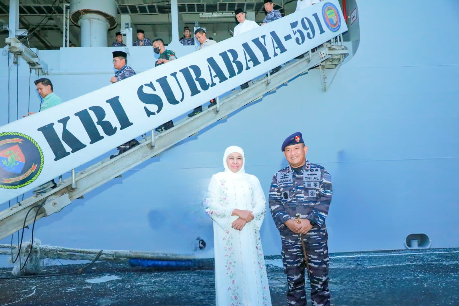SURABAYA, tNews.co.id – Gubernur Jawa Timur Khofifah Indar Parawansa bersama Panglima Komando Armada (Pangkoarmada) II Laksamana Muda TNI Maman Firmansyah melaksanakan qiyamul lail di di atas Kapal Republik Indonesia (KRI) Surabaya 591, Rabu (12/4) dini hari.