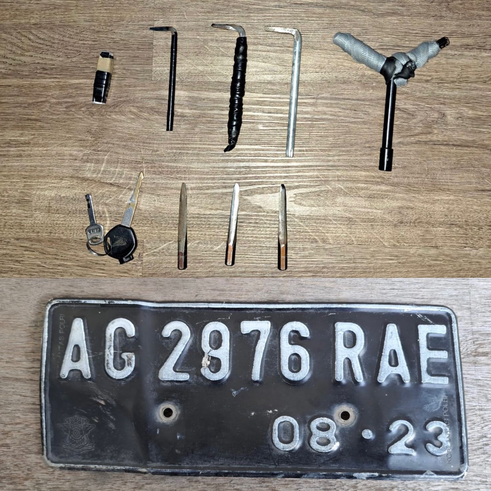 Hasil dari penangkapan terhadap BMT, petugas juga menyita barang bukti, satu unit sepeda motor beat (sarana), satu buah plat nopol palsu, tiga buah mata kunci T, tiga buah kunci leter L, satu buah kunci leter Y.