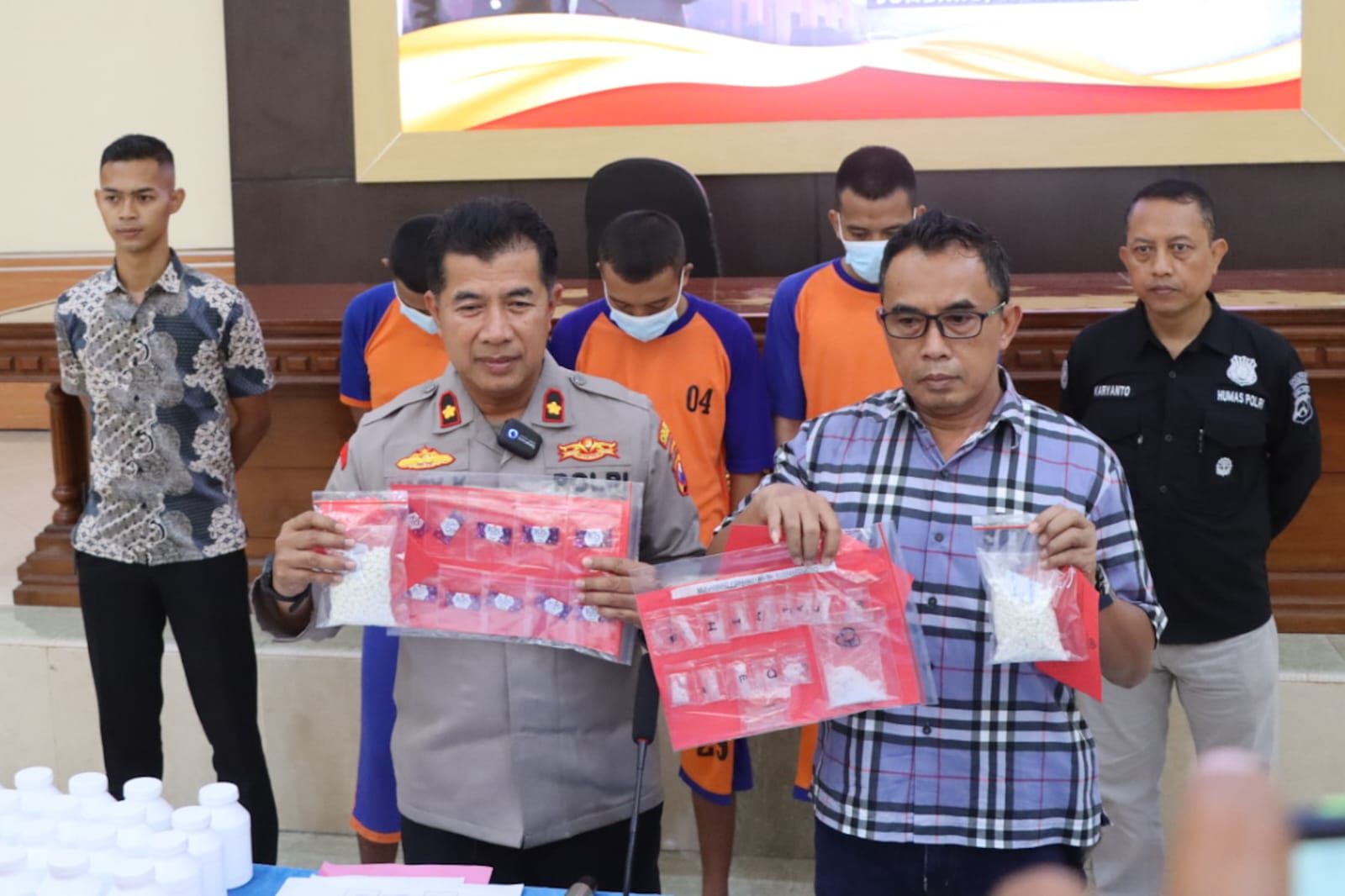 Dari penangkapan itu, poliisi berhasil menemukan barang bukti narkotika berbagai jenis. Yaitu sabu-sabu seberat 34,57 gram sabu dan pil double L sebanyak 20 ribu butir yang disimpan di dalam 20 botol plastik.