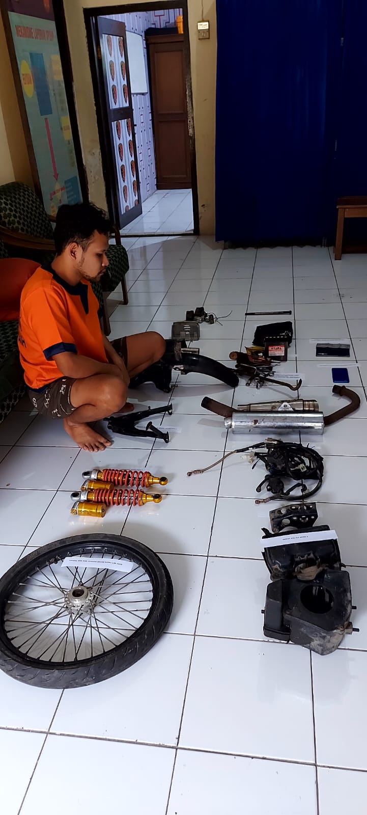 Barang bukti yang diamankan satu handphone, satu set alat bengkel, satu set jagang tengah dan samping, satu set peleg depan legkap ban dan tromol, dua sekok belakang, satu set lampu reting belakang, satu as Arem, satu kenalpot, satu pangkon mesin, satu set pangkon lampu, satu kenalpot, satu rantai. Kerugian materil sekitar Rp 4 juta.