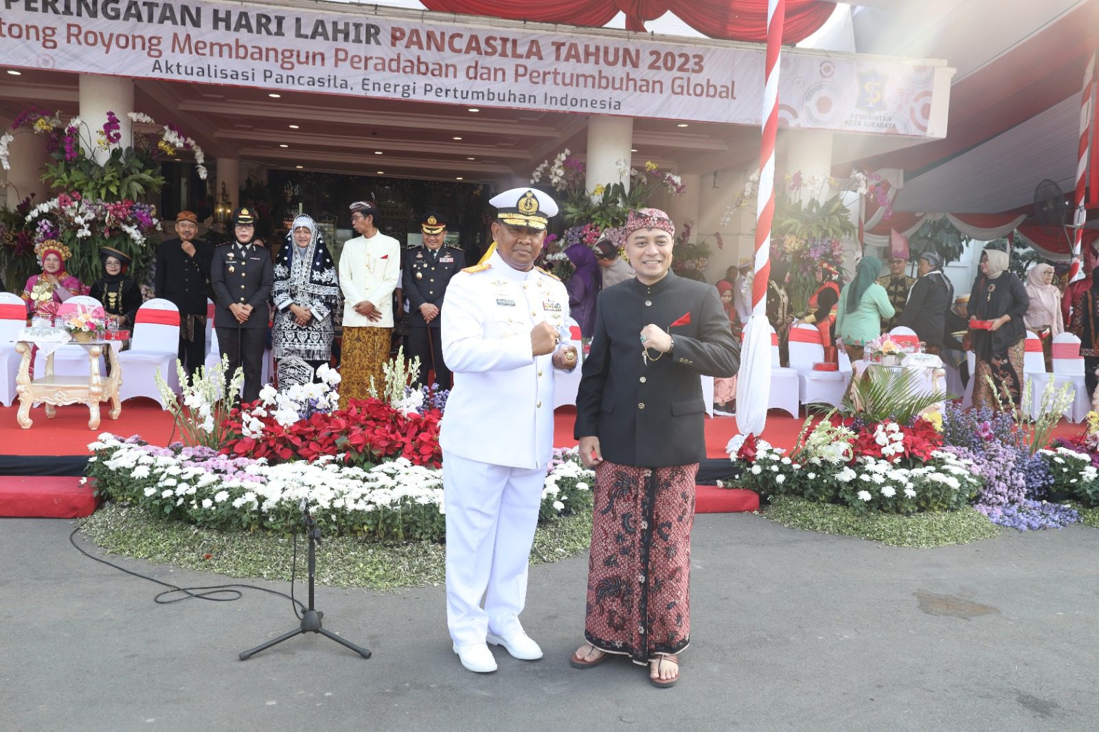 Hadir dalam Upacara peringatan hari lahir Pancasila Wakil Wali Kota Surabaya Ir. H. Armuji, pejabat TNI dan Polri wilayah Surabaya dan Forkopimda wilayah Surabaya.