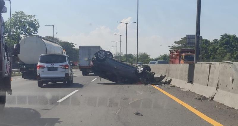 Akibatnya, Kendaraan abu-abu metalik itu terpental dan mendarat dalam posisi terbalik tepat di KM 752. Beruntung nyawa Muhammad Arif masih selamat meski menderita luka ringan.