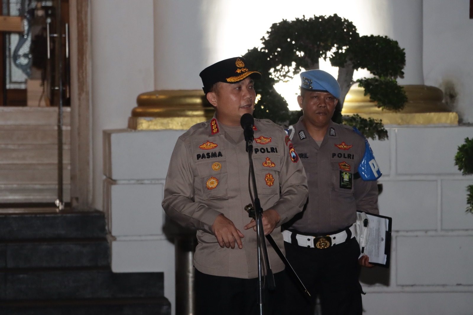 Kapolrestabes Surabaya Kombes Pol Pasma Royce saat memimpin apel di halaman Mapolrestabes mengatakan, pada kesempatan malam hari ini sebagai bukti persiapan kita untuk hadir di tengah masyarakat serta memastikan situasi kota Surabaya harus dalam keadaan aman dan kondusif di malam HUT Persebaya Surabaya.
