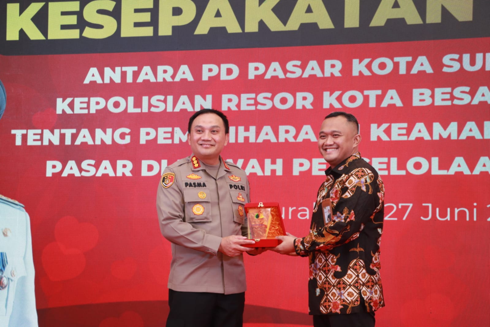 Kapolrestabes Surabaya Kombes Pol Pasma Royce Menandatangani kesepakatan kerjasama dengan Dirut PD Pasar Surya Agus Priyo Akhirono disaksikan Walikota Surabaya Eri Cahyadi, Kesepakatan ini bertujuan untuk menjaga ketertiban, mencegah tindak kejahatan, dan meningkatkan perlindungan bagi para pedagang dan pengunjung pasar.