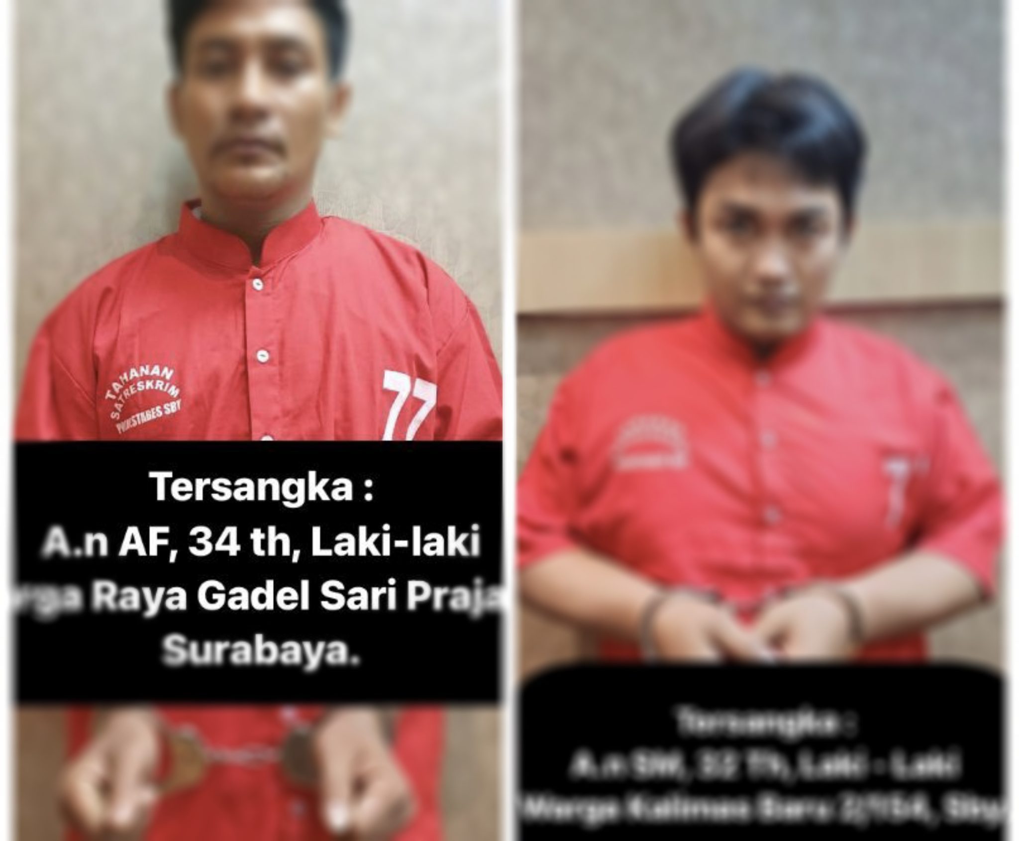 Kedua pelaku yang ditangkap adalah SM (32), warga Kalimas Baru, Surabaya dan AR (34), warga Gadel, Tandes, Surabaya. Sedangkan satu pelaku lain yang masih diburu polisi adalah MA’UD (DPO).
