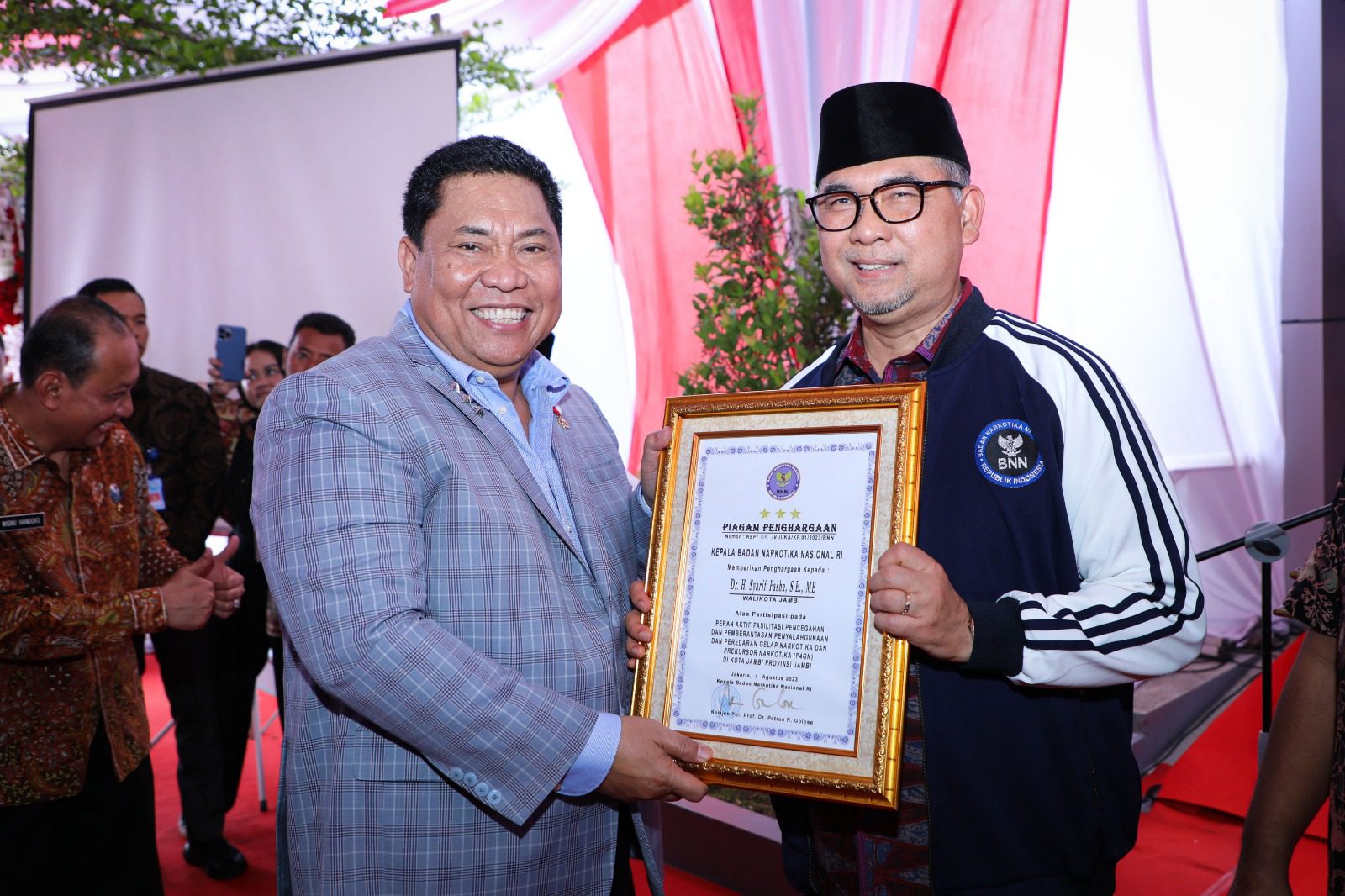 Pada kesempatan yang sama, Kepala BNN RI, Komjen Pol. Prof. Dr. Petrus Reinhard Golose, juga memberikan piagam Penghargaan Pencegahan dan Pemberantasan Penyalahgunaan dan Peredaran Gelap Narkotika (P4GN). Penghargaan ini diberikan kepada pemangku kepentingan yang telah menunjukkan perhatiannya dalam mengimplementasikan P4GN di Jambi.