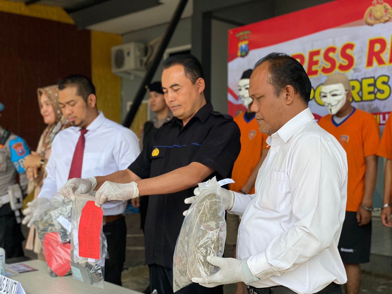Iptu Ariek menjelaskan tiga orang yang saat ini sudah ditetapkan tersangka itu diamankan beserta barang bukti Daun Ganja kering sebanyak 1,07 Kg, 3 Unit Hp, 1 Bendel kertas papir, 5 (lima) pak plastic klip bening, 1 (satu) buah timbangan, dan beberapa barang bukti lainnya.