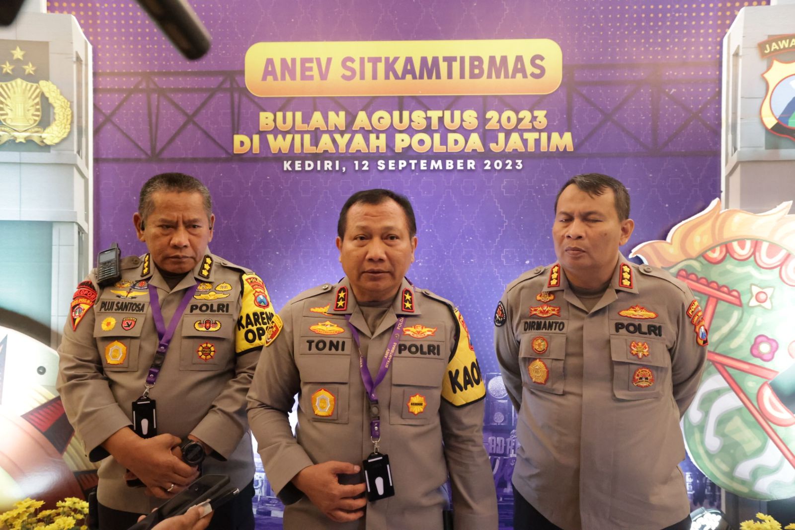Hal itu seperti disampaikan oleh Kapolda Jawa Timur Irjen Pol Dr.Toni Harmanto,M.H saat menggelar Analisa dan Evaluasi (Anev) Sitkamtibmas bulan Agustus 2023, di Kota Kediri Jawa Timur bersama para pejabat utama (PJU) Polda Jatim dan diikuti oleh Kapolres/ta jajaran Polda Jatim, Selasa (12/9/2023).