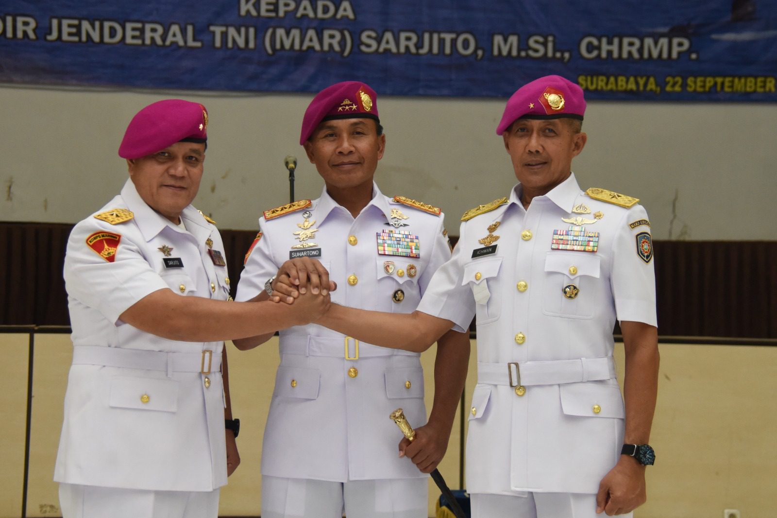 SURABAYA, JATIM II tNews.co.id – Dalam rangka regenerasi Pejabat Utama di lingkungan Kodiklatal, Komandan Komando Pembinaan Doktrin Pendidikan dan Latihan TNI AL (Dankodiklatal) Letjen TNI Marinir Suhartono memimpin pergantian jabatan Kepala Kelompok Tenaga Pendidik (Kapokgadik) Kodiklatal yang secara resmi diserahterimakan dari Brigjen TNI Marinir Ichwan Dargianto kepada Brigjen TNI Marinir Sarjito, bertempat di Gedung R.E. Martadinata Kodiklatal Bumimoro Surabaya. Jumat, (22/09/2023).