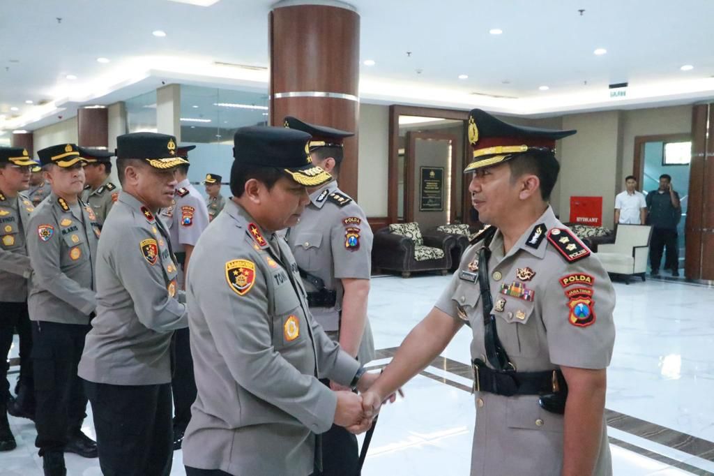 Dua pejabat utama Polda Jatim itu menjalani sertijab sekaligus dilantik di gedung Mahameru, Markas Polda Jawa Timur.