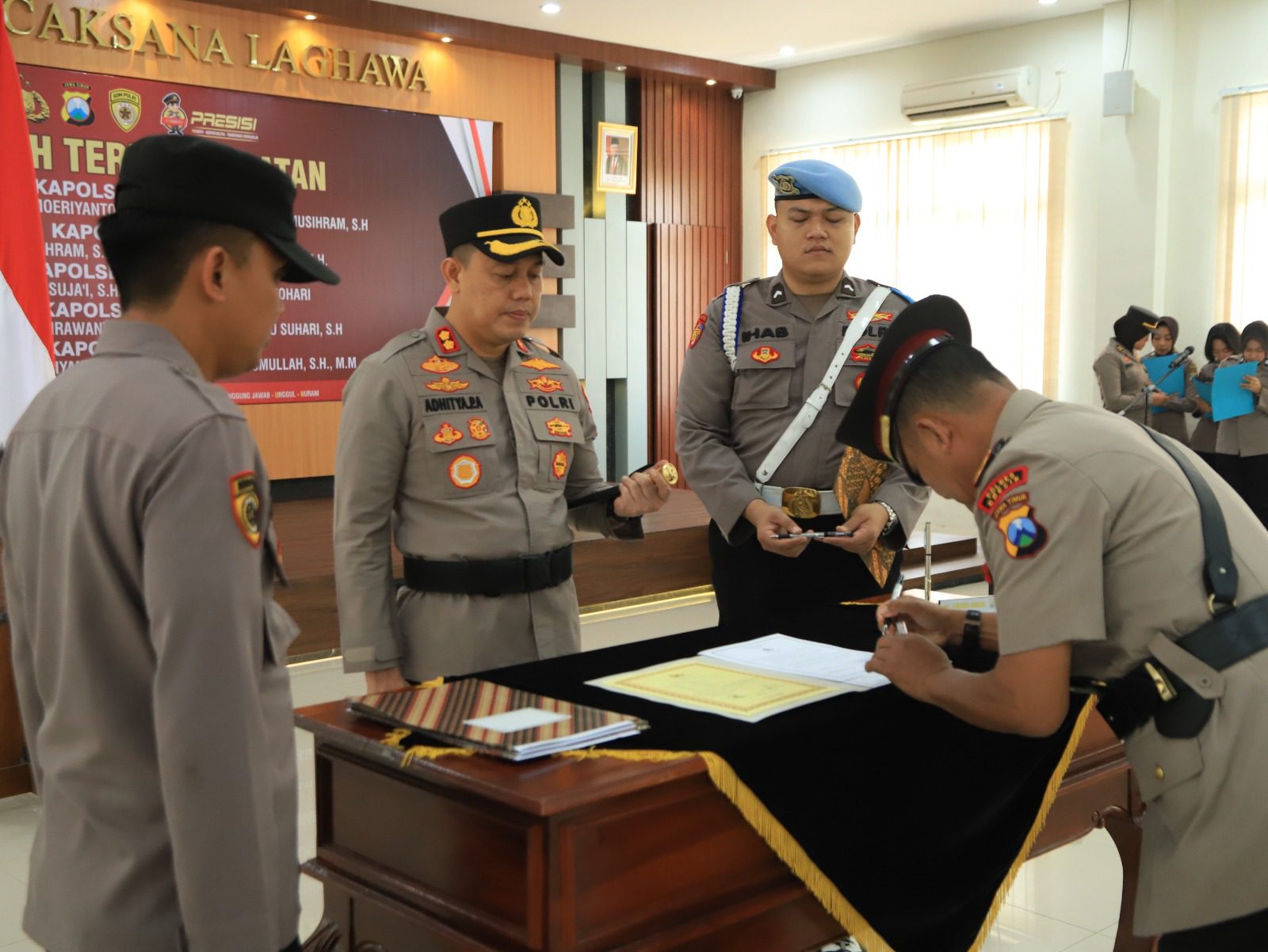 Sertijab Kapolsek dan Pejabat Utama Polres Gresik dihadiri oleh Wakapolres Gresik, Kompol Erika Purwana Putra, Pejabat Utama (PJU) Polres Gresik, Kapolsek jajaran Polres Gresik.