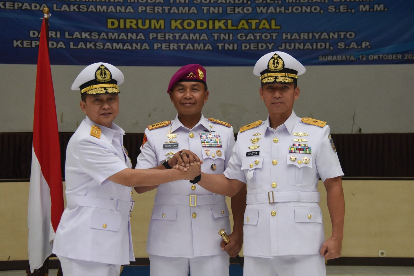 SURABAYA, JATIM II tNews.co.id – Responsif dan antisipatif dalam menghadapi tantangan tugas yang semakin dinamis dan kompleks, Komandan Komando Pembinaan Doktrin Pendidikan dan Latihan TNI AL (Dankodiklatal) Letjen TNI Marinir Suhartono memimpin Serah Terima Jabatan (Sertijab) Wakil Komandan (Wadan) Kodiklatal dan Direktur Umum (Dirum) Kodiklatal, bertempat di Gedung R.E. Martadinata Kodiklatal, Bumimoro Surabaya. Kamis,(12/10/2023.