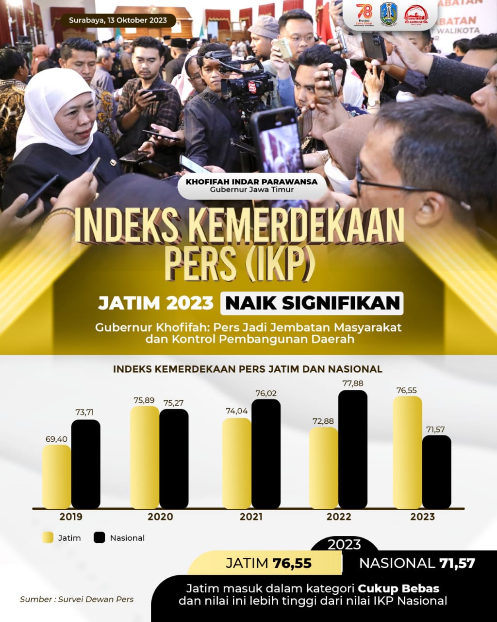 KOTA SURABAYA, JATIM II tNews.co.id – Indeks Kemerdekaan Pers (IKP) Jawa Timur naik signifikan di tahun 2023. Berdasarkan hasil survei IKP Indonesia yang diselenggarakan Dewan Pers tahun 2023, IKP Jatim ada di angka 76,55.