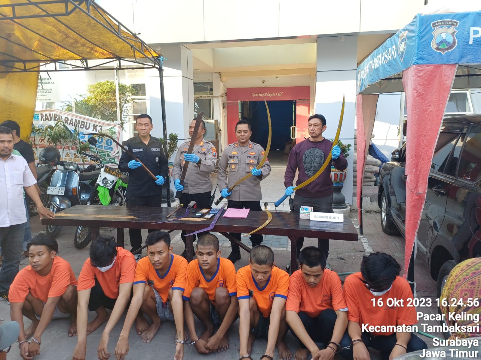 “Selanjutnya anggota Polsek Tambakssri yang dipimpin oleh Kapolsek Tambaksari Kompol Ari Bayuaji.,S.E.,.I.K.,M.Si bersama Anggota Respati Polrestabes Surabaya bergegas mendatangi TKP dan berhasil mengamankan 7 (tujuh) remaja yang akan melaksanakan tawuran dengan membawa 9 (sembilan) buah senjata tajam.