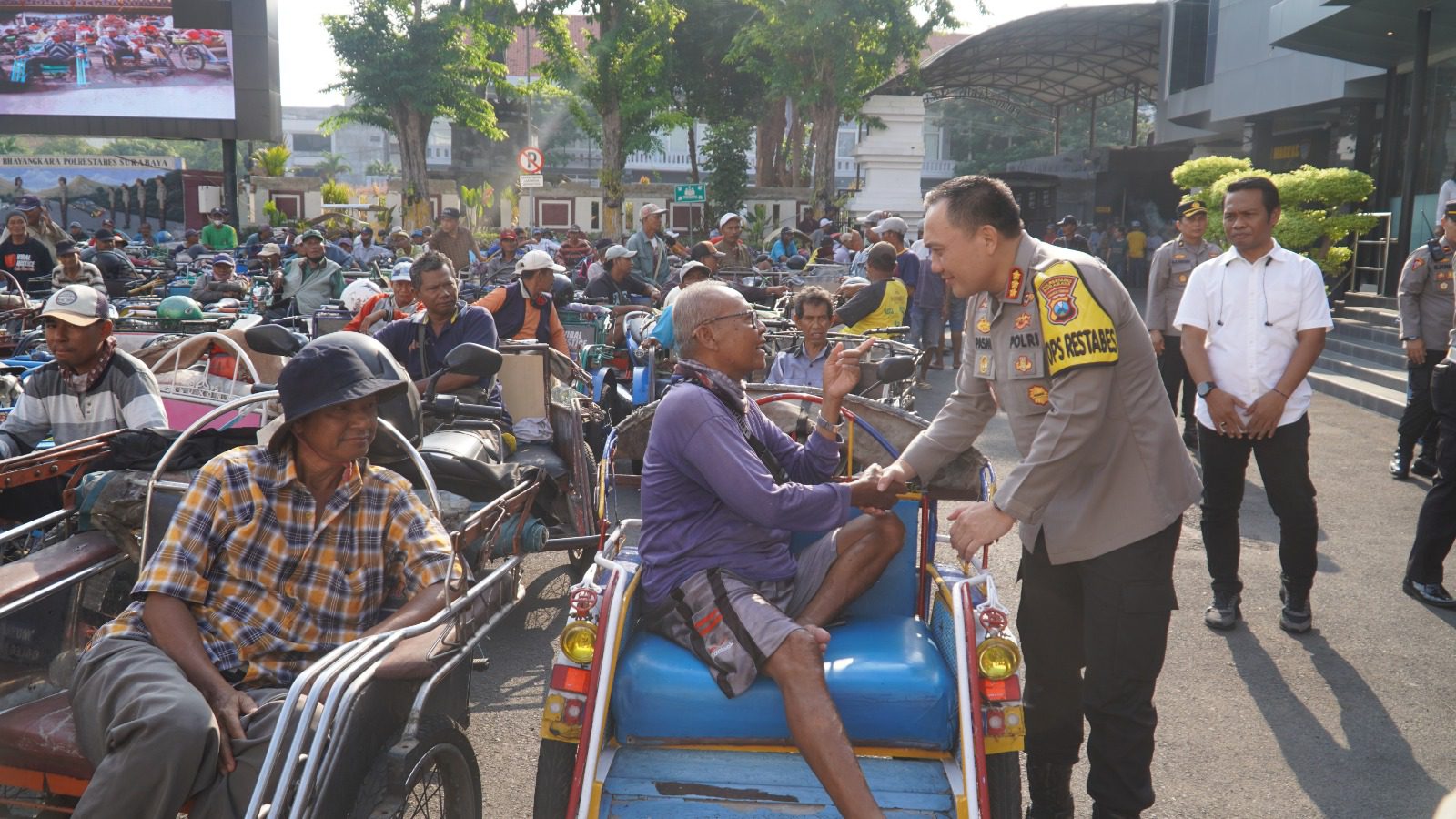 Kapolrestabes Surabaya Polda Jatim, Kombespol Pasma Royce dengan didampingi Pejabat Utama (PJU) langsung menyapa sekitar 500an abang becak yang sengaja diundang untuk sarapan bersama sambil cangkrukan dan membagikan paket sembako.