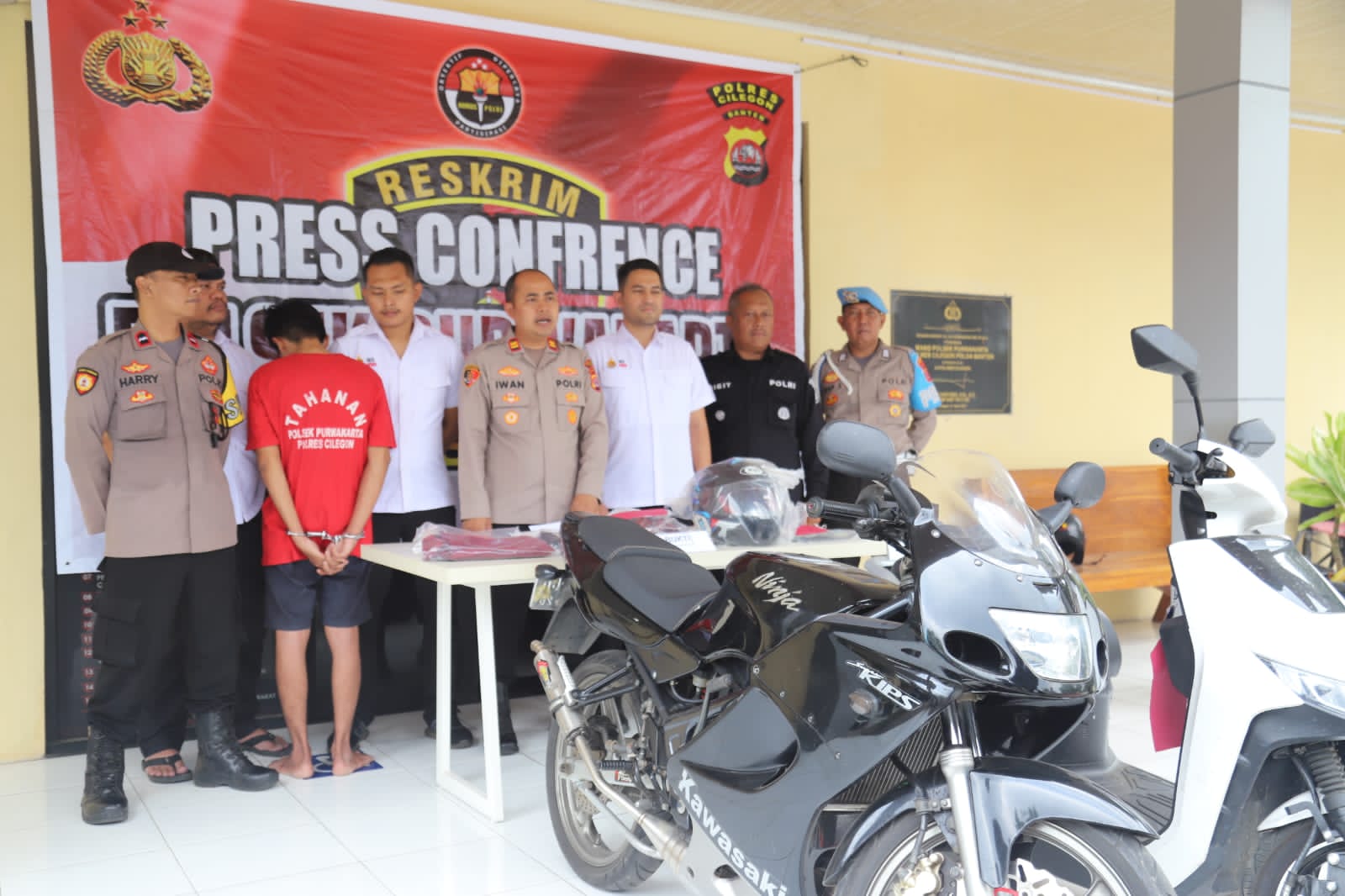 Iwan mengatakan pihaknya berhasil mengamankan beberapa barang bukti. “Barang bukti yang disita yaitu satu unit kendaraan bermotor merk Kawasaki Ninja Nopol: A-6861-SM warna hitam, satu unit sepeda motor merk Yadea T9 warna putih milik pelaku, satu buah helm jenis full face merk KYT warna hitam biru, satu buah jaket warna merah maroon milik pelaku, satu buah kaos warna hitam milik pelaku,”
