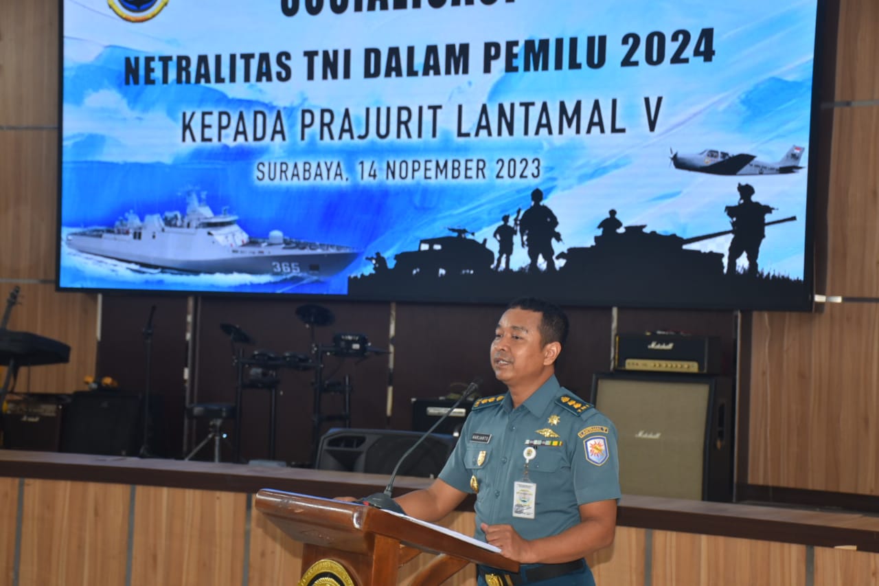 Surabaya, JATIM II tNews.co.id – Dalam rangka persiapan Pemilu Tahun 2024, Dinas Hukum (Diskum) Lantamal V menggelar Sosialisasi Netralitas TNI dalam Pemilu 2024 kepada personel Lantamal V yang di pimpin langsung Kadiskum Lantamal V Letkol Laut (H) Harjanto, S. H bertempat di Gedung Serbaguna Mako Lantamal V Perak Surabaya. Selasa (14/11/2023)