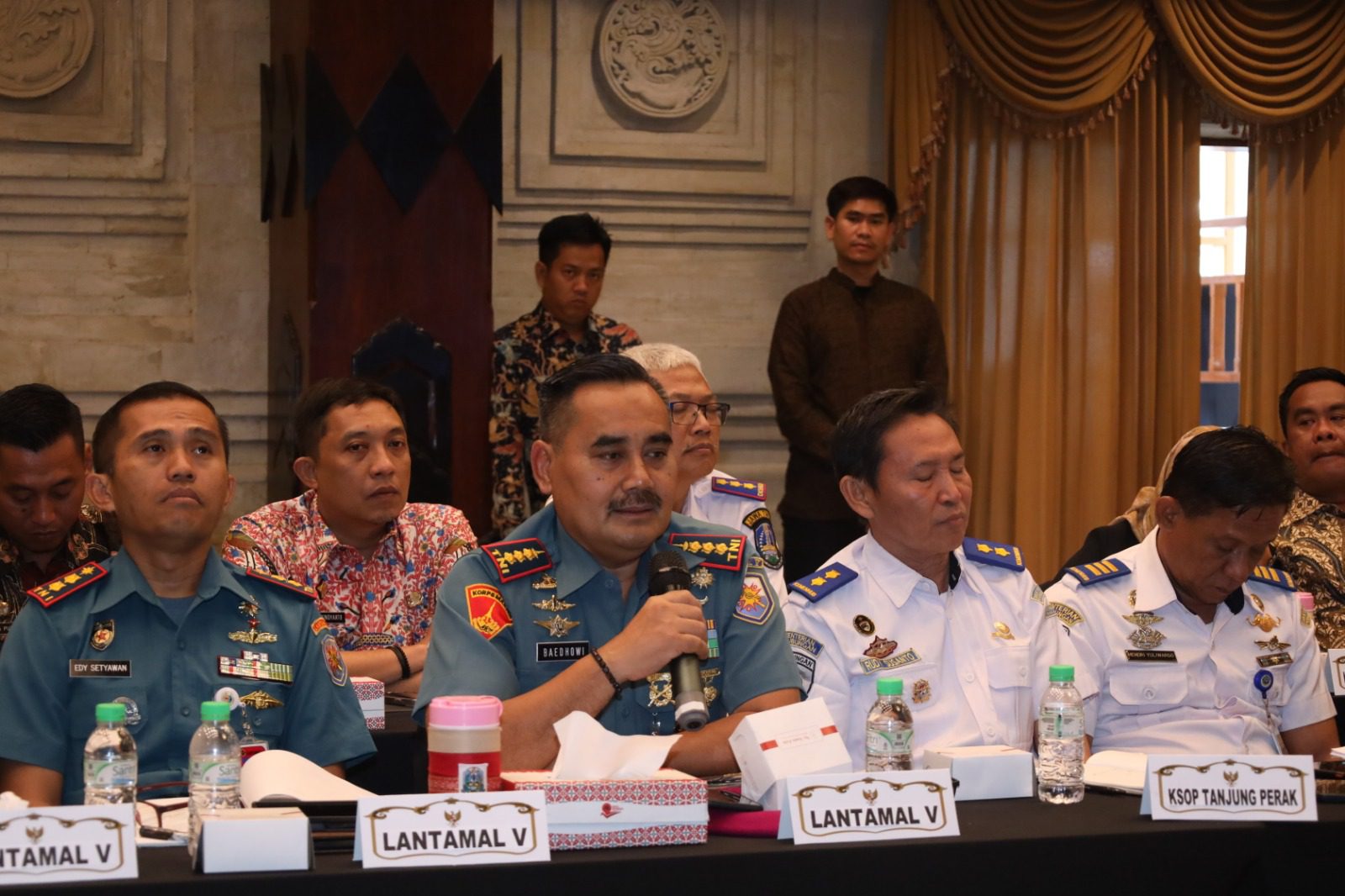 Surabaya, JATIM II tNews.co.id – Komandan Pangkalan Utama TNI AL (Danlantamal) V Brigjen TNI Marinir Joni Sulistiawan Diwakili Wadan Lantamal V Kolonel Marinir Baedhowi Oktadifia menghadiri kunjungan kerja Panpus DPR RI bertempat di ruang Binaloka Adhikara Sekda Prov Jawa Timur. Selasa (14/11/2023).