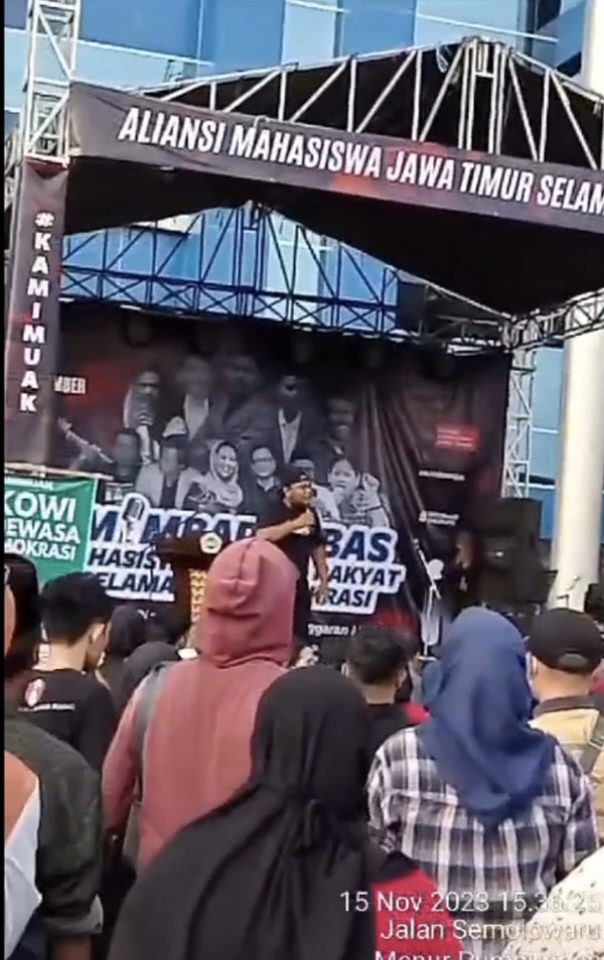 Surabaya, JATIM II tNews co.id – Aliansi Mahasiswa Jawa Timur yang tergabung dalam berbagai Universitas di Kota Surabaya menggelar aksi demonstrasi di depan gedung Dewan Perwakilan Rakyat Daerah Jawa Timur. Rabu (15/11/23, Mereka membentang kan sejumlah poster dan spanduk di depan penjagaan aparat kepolisian.