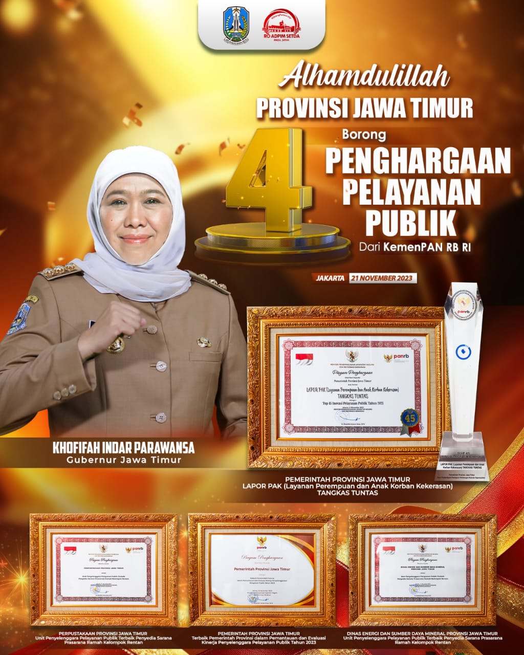 Secara khusus, Gubernur Khofifah menyampaikan apresiasi dan rasa bangganya atas empat penghargaan yang dibawa pulang oleh Provinsi Jatim. Menurutnya, penghargaan ini menjadi wujud dan bukti komitmennya dalam memberikan pelayanan publik yang berkualitas dan berdampak pada masyarakat.
