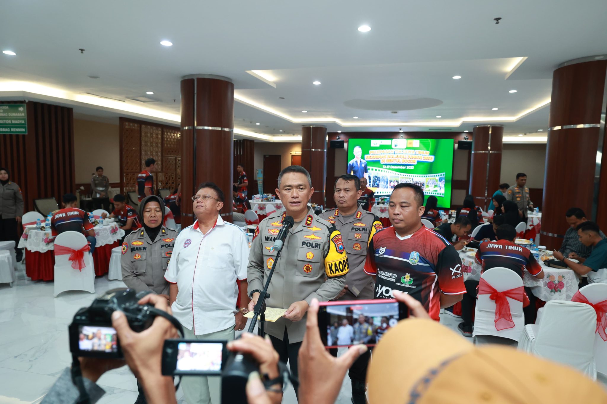 Surabaya, JATIM II tNews.co.id  – Kapolda Jawa Timur Irjen Pol Drs Imam Sugianto,M.Si bersama Pejabat Utama (PJU) Polda Jatim melepas Tim putra putri Jawa Timur Kejuaraan Nasional (Kejurnas) Bola Voli Junior 2023, yang akan berlaga di Sentul Bogor, pada tanggal 12 sampai dengan 17 Desember 2023 mendatang.