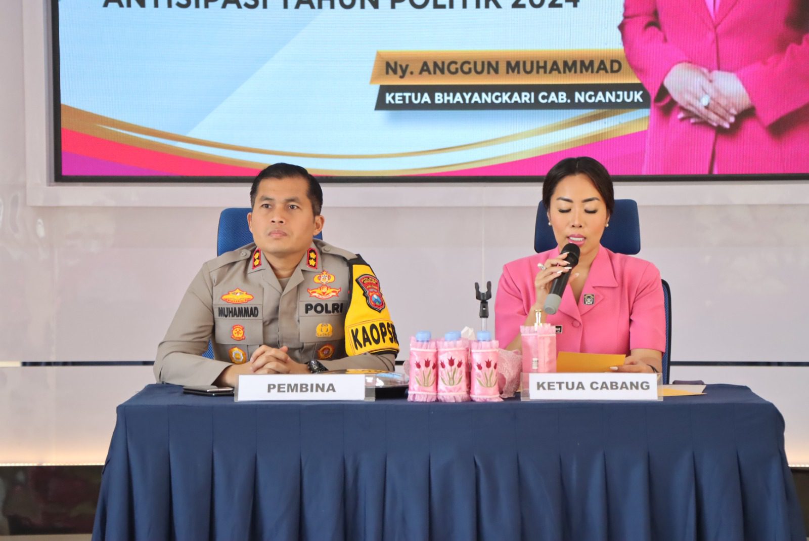 Senada dengan Kapolres, Nyonya Anggun Muhammad, Ketua Bhayangkari Cabang Nganjuk menyampaikan bahwa Bhayangkari bukan hanya sekadar istri dari anggota Polri, tetapi juga memiliki tanggung jawab sosial yang besar terutama dalam memberikan dukungan moril dan semangat kepada suami-suami mereka.