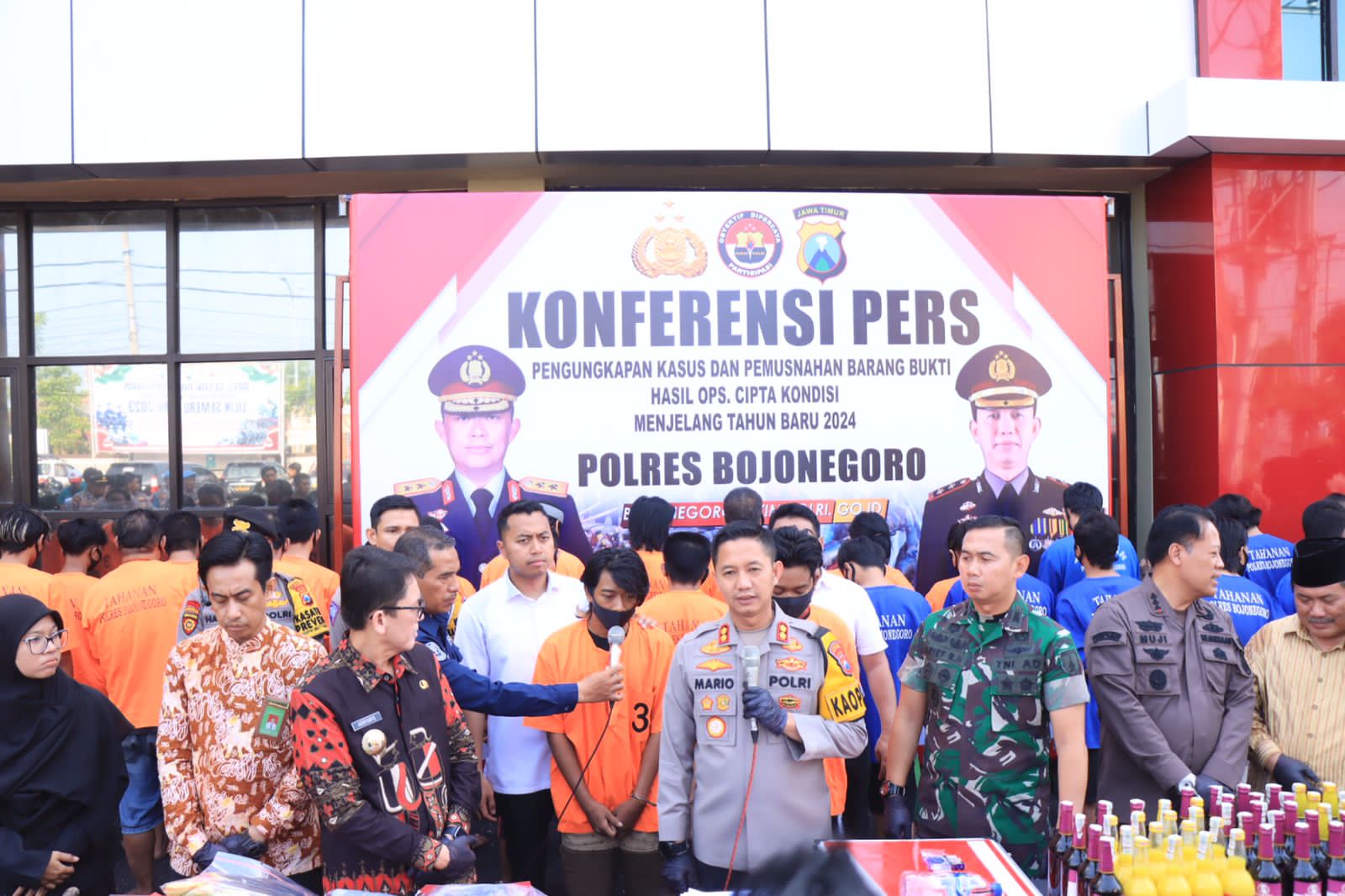 Hal tersebut disampaikan Kapolres Bojonegoro AKBP Mario Prahatinto, didampingi jajaran Forum Komunikasi Pimpinan Daerah (Forkopimda) Kabupaten Bojonegoro, dalam Konferensi Pers Pengungkapan Kasus dan Pemusnahan Barang Bukti hasil Operasi Cipta Kondisi sepanjang tahun 2023. Kamis (28/12/2022).