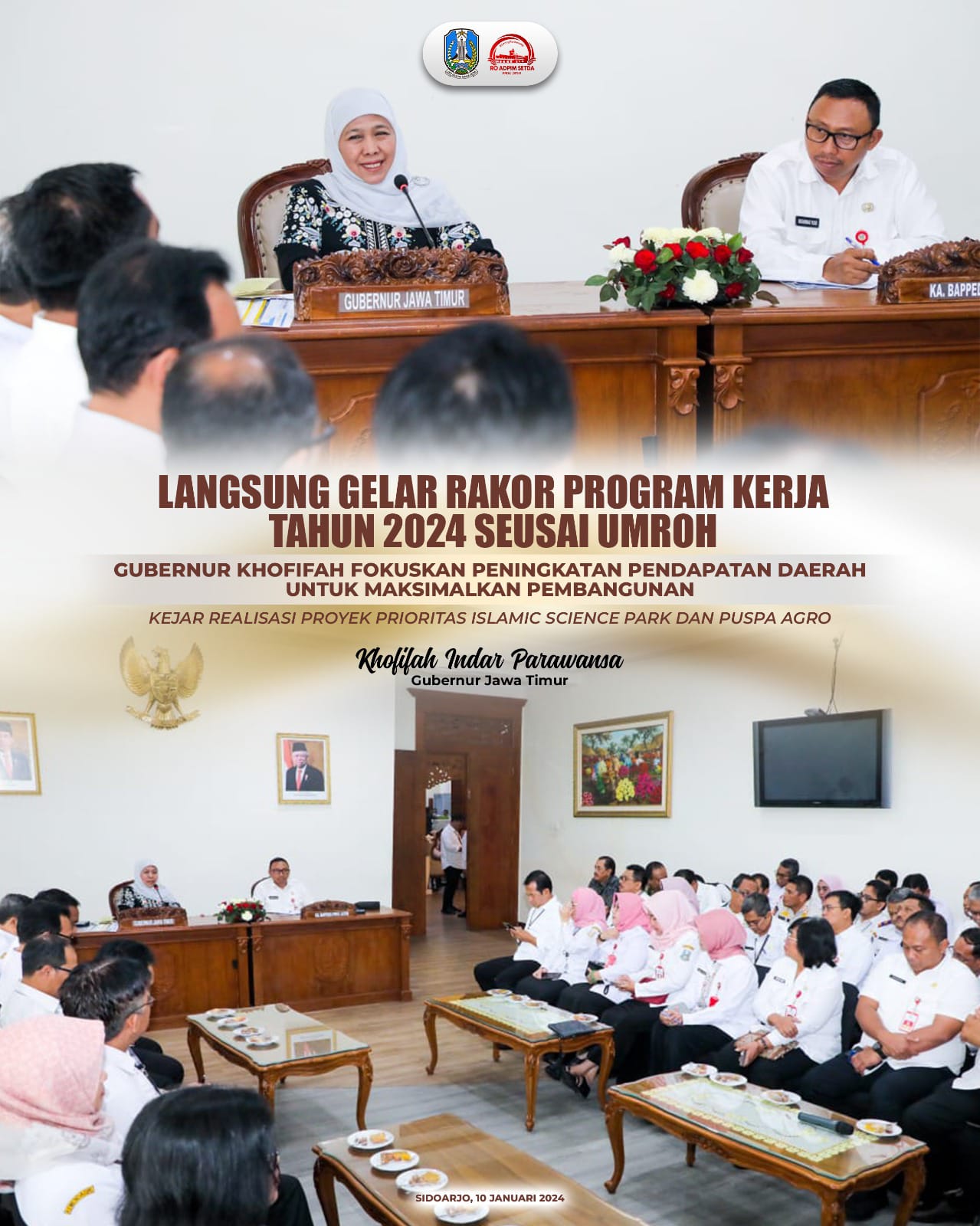 SIDOARJO, Jatim II tNews.co.id – Gubernur Jawa Timur Khofifah Indar Parawansa langsung memimpin rakor program kerja Pemprov Jatim Tahun 2024 begitu tiba di Bandara Juanda, Sidoarjo, usai menunaikan ibadah umroh pada Rabu (10/1).