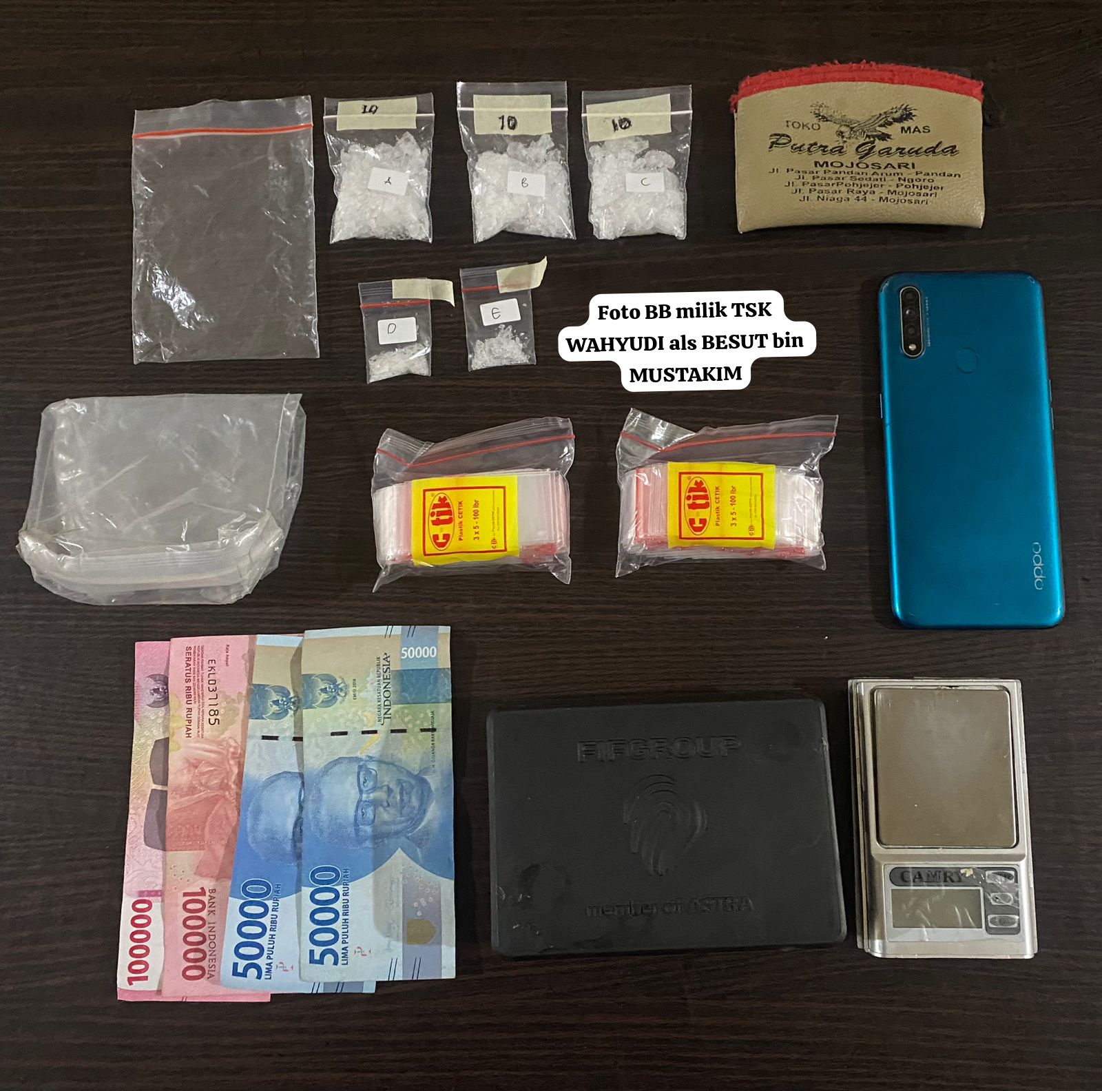 Dari hasil penangkapan yang dilakukan petugas terhadap Besut barang bukti yang diamankan terdiri dari Paket kode A dengan berat 10,18 gram, Kode B berat 10,12 gram, Kode C berat 10,16 gram, Paket D berat 1,02 gram, kode E dengan berat 1,02 gram