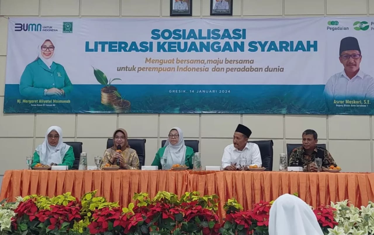 GRESIK, Jatim II tNews.co.id – Dalam rangka pemberdayaan kader yang termaktub dalam tema Menguat bersama, Maju Bersama untuk Perempuan Indonesia dan Peradaban Dunia. Pimpinan Pusat Fatayat NU turun gunung ke Gresik menggelar kegiatan Sosialisasi Literasi Keuangan Syariah di Aula Ainul Yaqin Dinas Pendidikan Kabupaten Gresik, Minggu (14/1/2024).