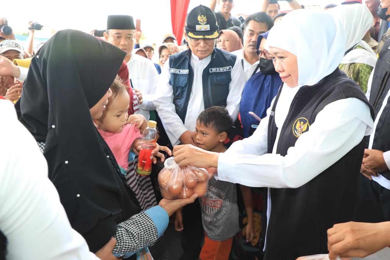 Dalam kesempatan ini, Gubernur Khofifah turut mengajak masyarakat yang membawa anak kecil untuk berbaris mengantre. Ia secara langsung membagikan 1 kg telur gratis kepada para ibu hamil dan balita. Begitu juga para lansia yang menerima 5 kg beras gratis darinya.