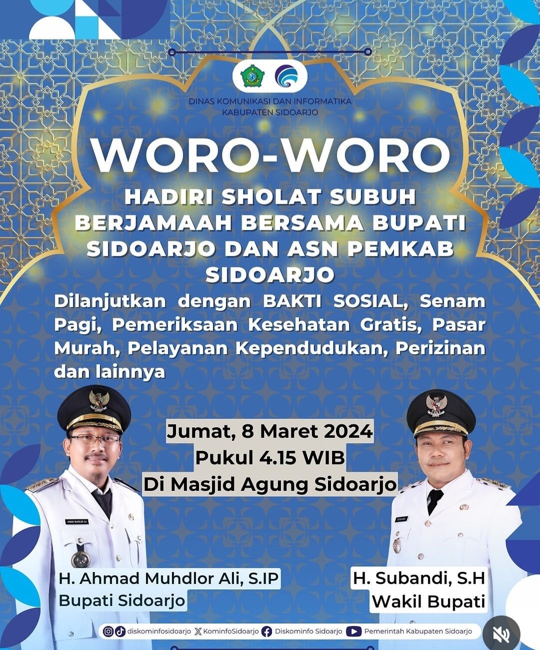 Tepat pukul 04.00 Wib besok hari Jum’at, semua pegawai Pemkab Sidoarjo diharapkan hadir mengikuti sholat shubuh berjama’ah dengan Bupati Sidoarjo di Masjid Agung Sidoarjo (MAS).