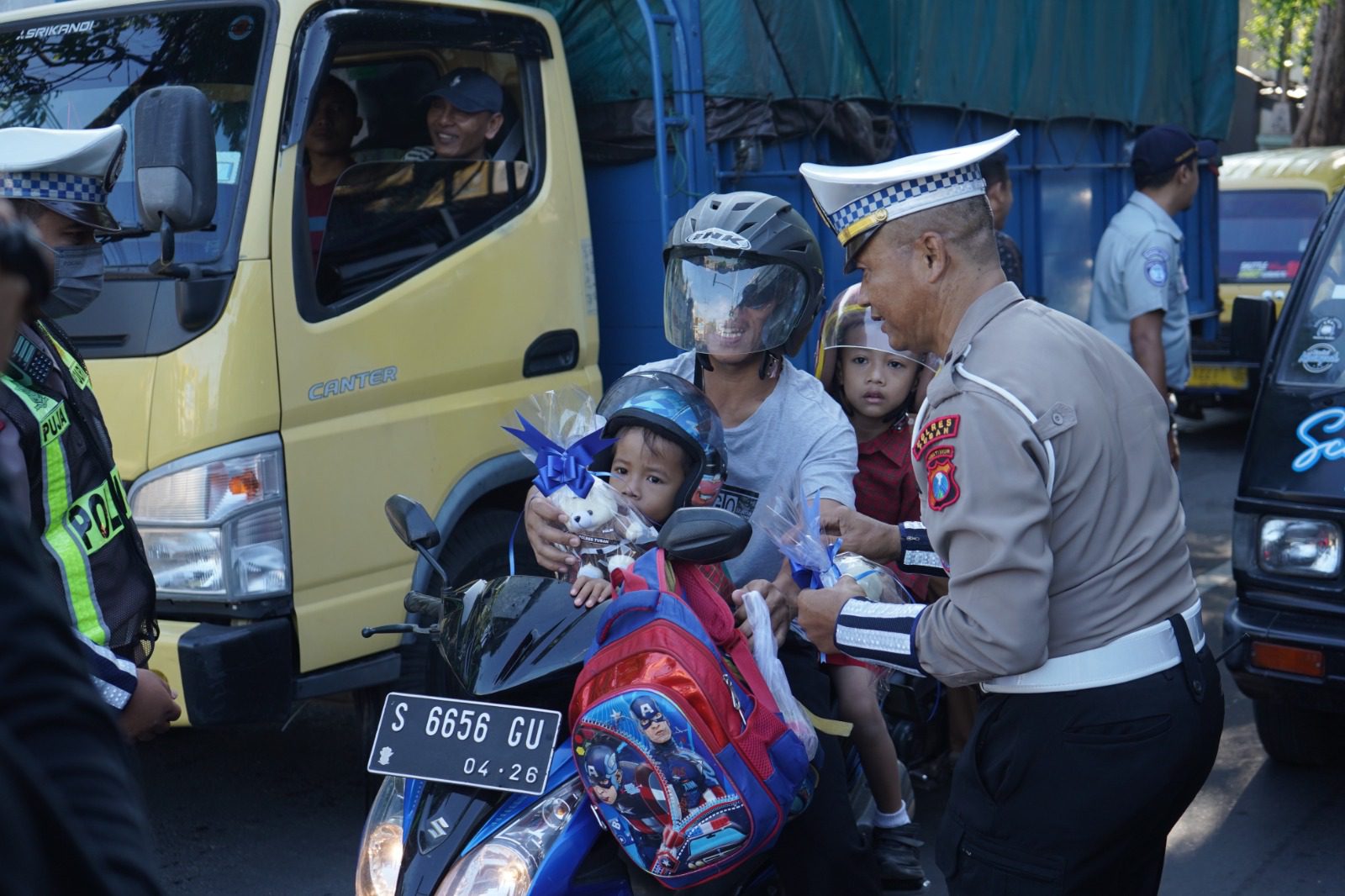 Seperti yang terlihat pada Sabtu (09/03/2024), sejumlah anggota satlantas Polres Tuban berjajar di jalan memberikan souvernir berupa boneka kepada para pengguna jalan yang dinilai mematuhi aturan dalam berlalu lintas.