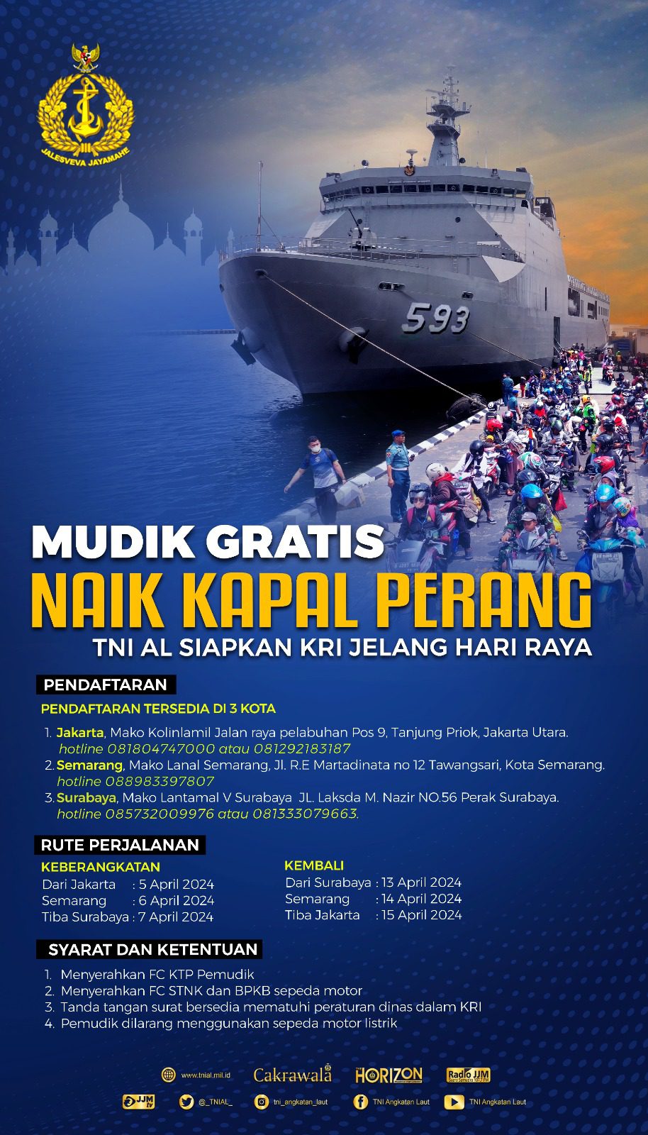 SURABAYA, Jatim II tNews.co.id – Bagi masyarakat umum yang belum mendapatkan tiket mudik tahun 2024 tidak perlu khawatir, tahun ini TNI Angkatan Laut (TNI AL) kembali menyiapkan satu Kapal Perang Republik Indonesia (KRI) khusus untuk penumpang angkutan serta pengendara sepeda motor yang akan melaksanakan perjalanan mudik lebaran tahun 2024 ke kampung halamannya di wilayah Pulau Jawa. Minggu (24/03/2024)