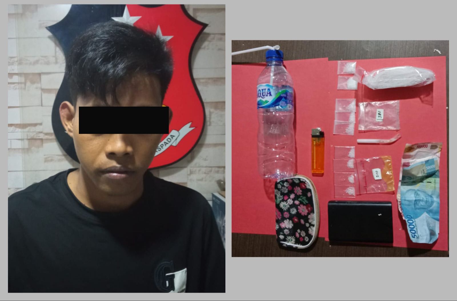 Dari penangkapan pelaku, diamankan sembilan poket klip narkotika jenis sabu, satu pipet yang berisikan sisa pembakaran sabu, satu buah bong, satu timbangan, satu buah korek api, satu pack yang berisikan plastik klip kosong, satu dompet dan uang tunai Rp.150.000.